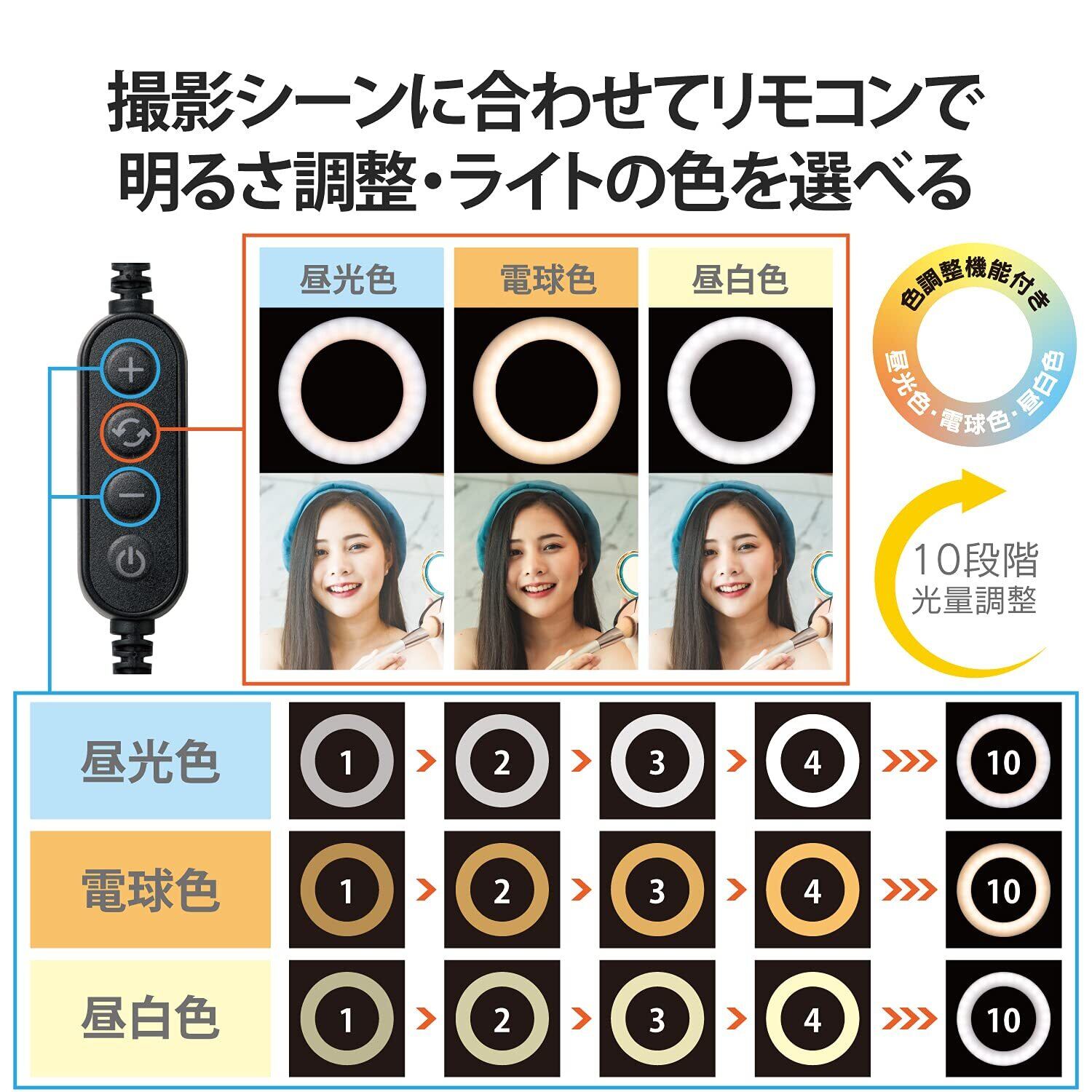 「このリングライトは、明るさを3色モード(暖色・自然光・白色)に切り替えることができるため、メイクや撮影、ライブ配信など、あらゆるシーンに合わせた演出が可能です。自分のイメージに合わせて最適な明るさを見つけられます!」