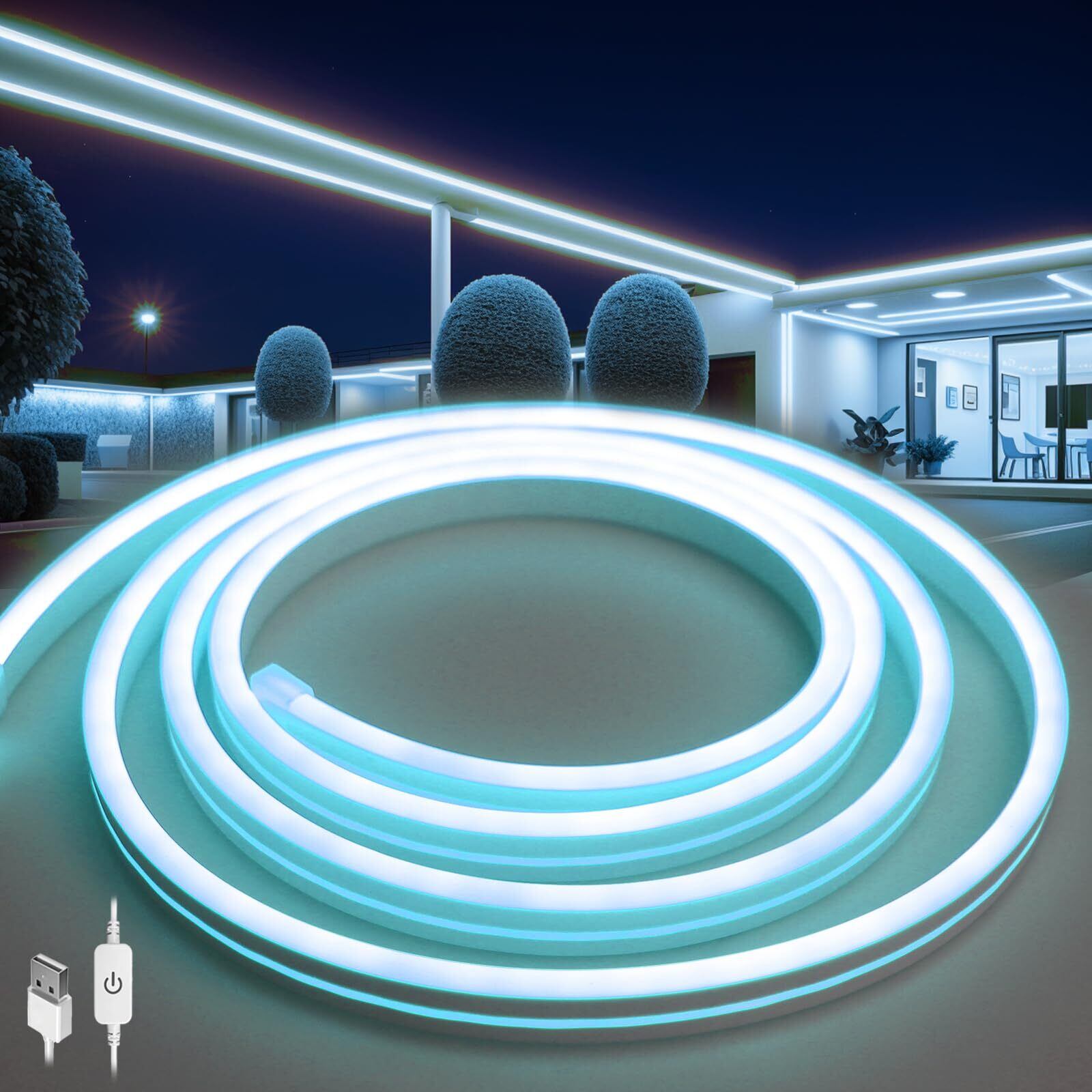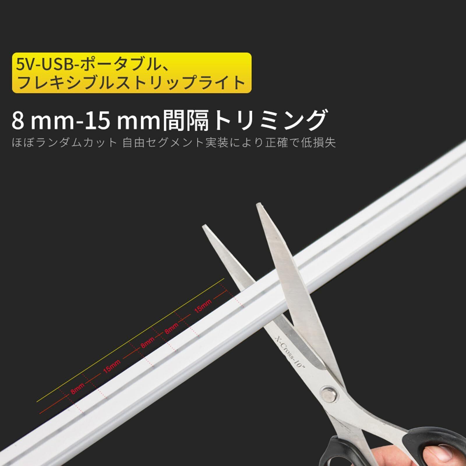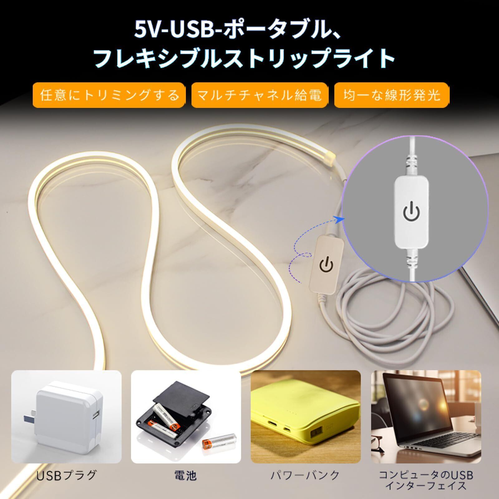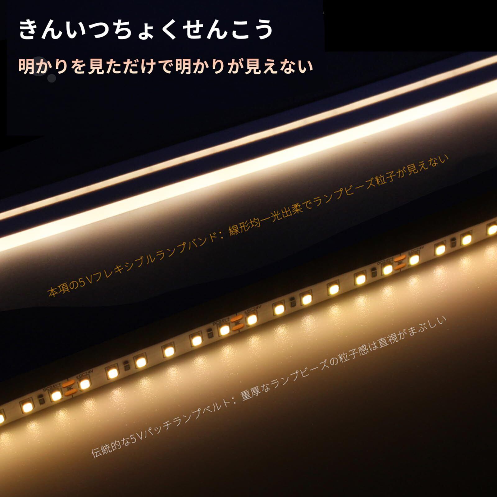 「新しい『5V-USB LEDテープライト』があなたの空間を一新します!調光が可能なこのLEDテープライトは、柔軟性があり、さまざまなシーンに合わせて使い方が広がります。防水仕様で屋内外どちらでも安心してご使用いただけます。」