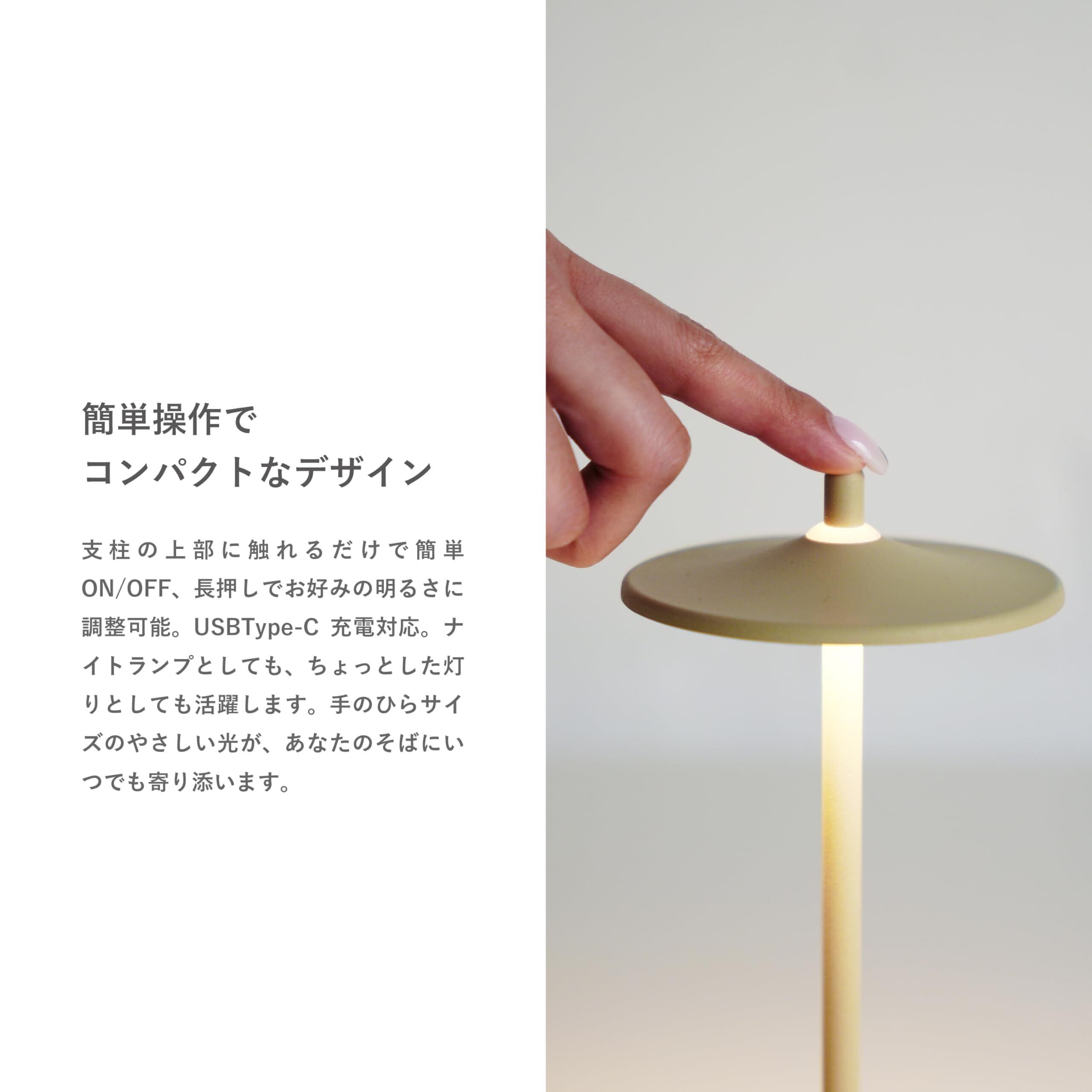 どこでも灯る、小さな傘のやさしい光 傘をイメージした、コンパクトで持ち運びやすいポータブルランプ。カラフルな4色展開で、こだわりのカラーが暮らしを彩ります。上部のでっぱりに触れるだけで簡単にON/OFF、長押しでお好みの明るさに調整可能。USB Type-C充電対応で、ナイトランプとしても、ちょっとした灯りとしても活躍します。手のひらサイズのやさしい光が、あなたのそばにいつでも寄り添います。