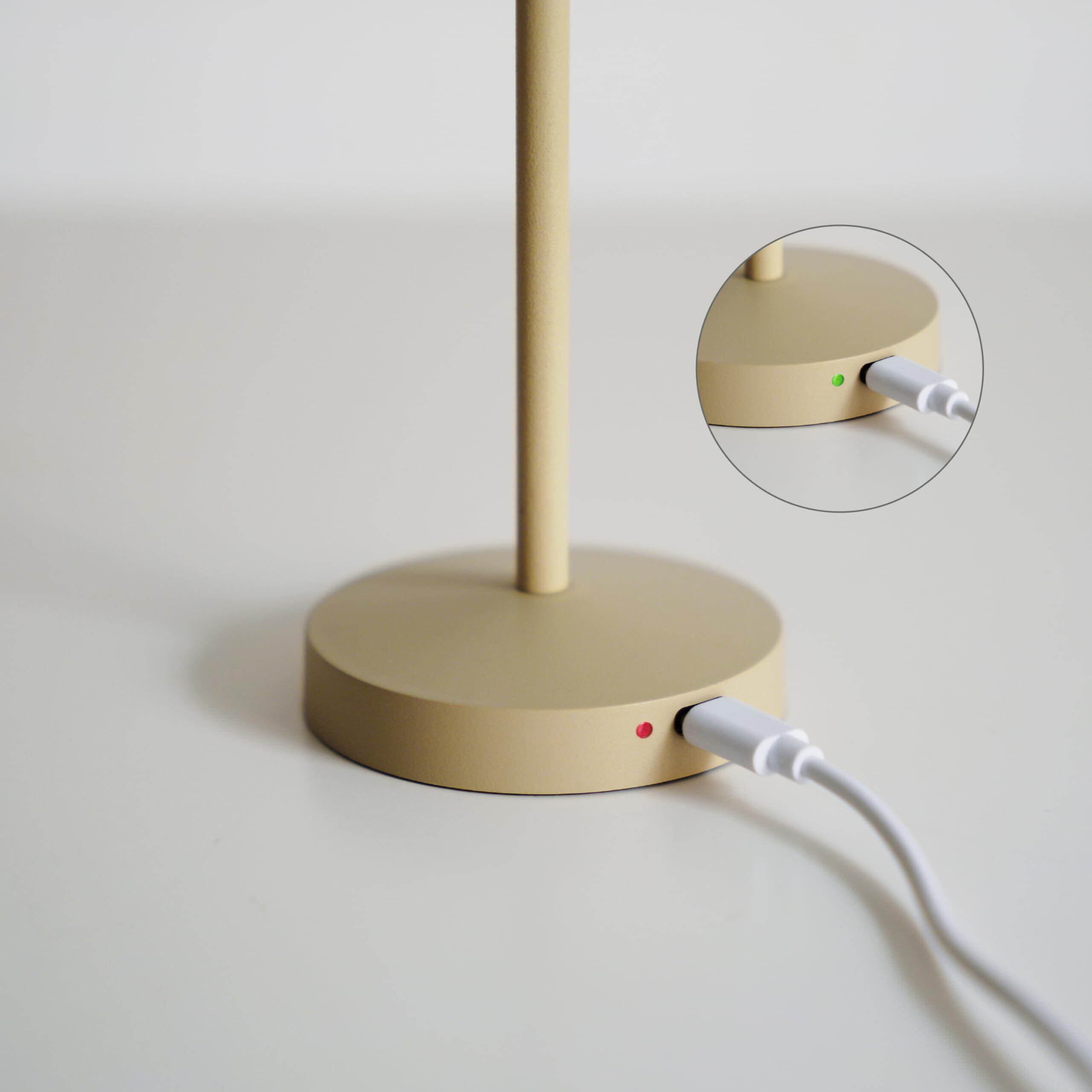 長押しで調光 ランプシェードの上部をタッチするとON/OFF 長押しで無段階調光ができます。 付属のケーブルでUSB type-Cで充電可能 満充電になるとランプの色が変わります。 約2-3時間で満充電 連続点灯時間 最大光量 約5時間点灯 最小光量で約170時間点灯