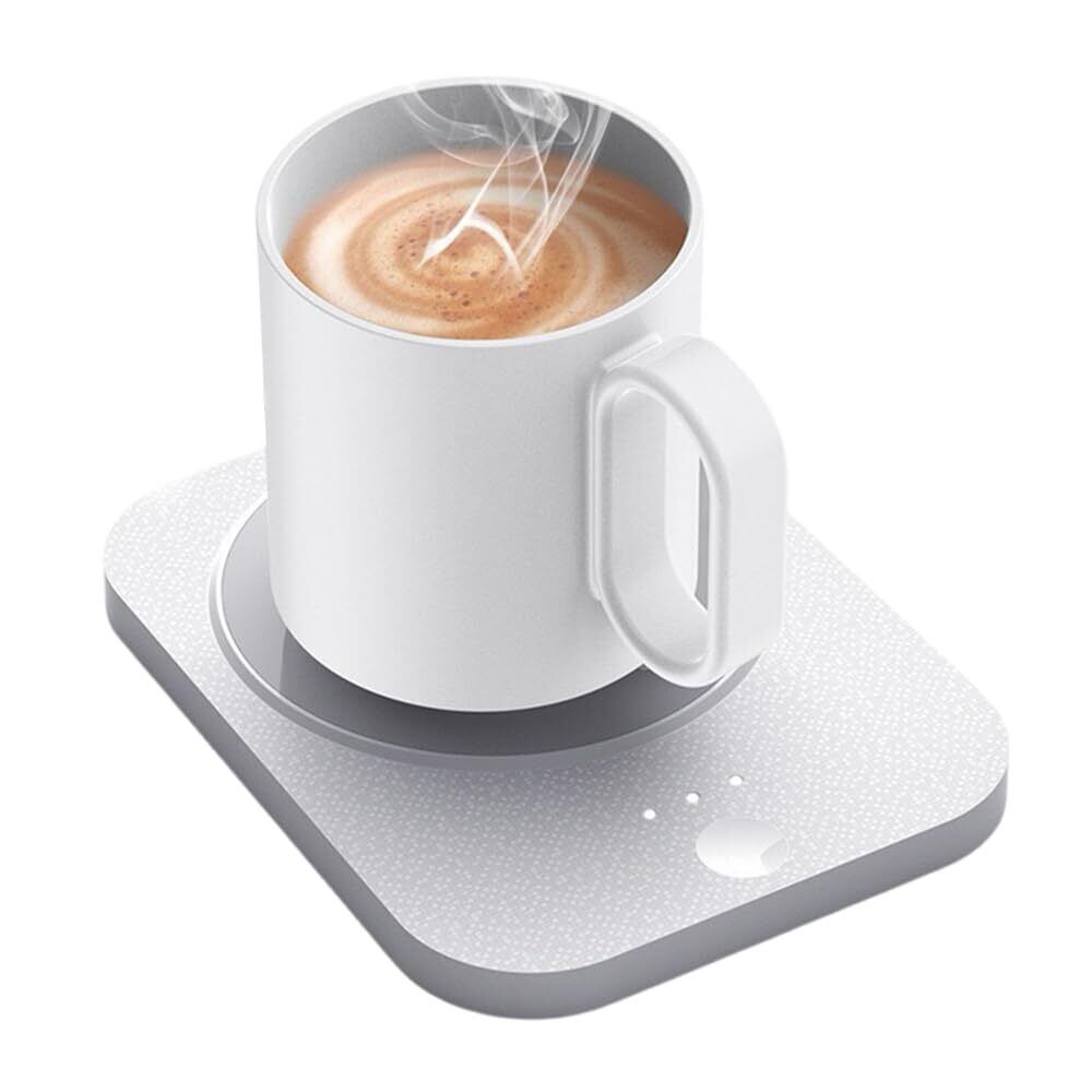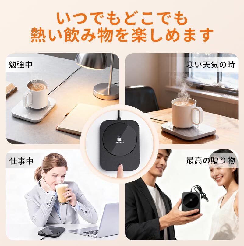 「新しい『カップウォーマー』が、あなたの飲み物をいつでも温かく保ちます!3段階の温度調節が可能で、50度、55度、60度の設定からお好みの温度を選べる便利なアイテムです。USB接続で簡単に使えるので、オフィスや家庭で大活躍します。」