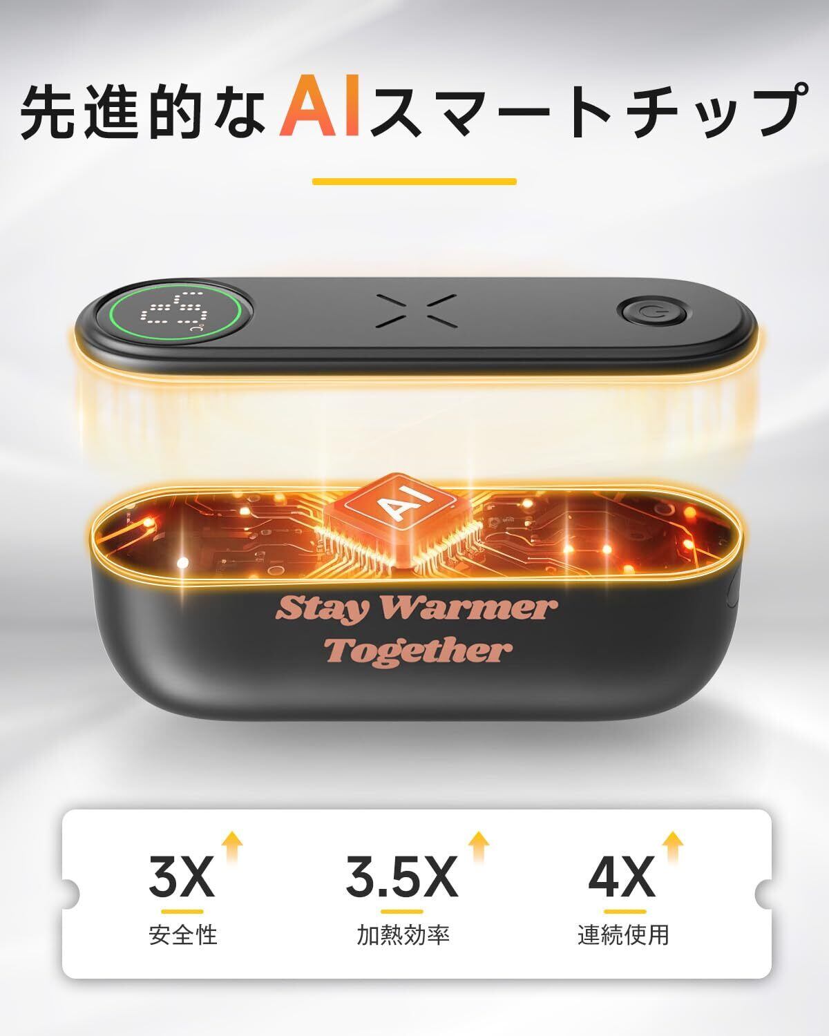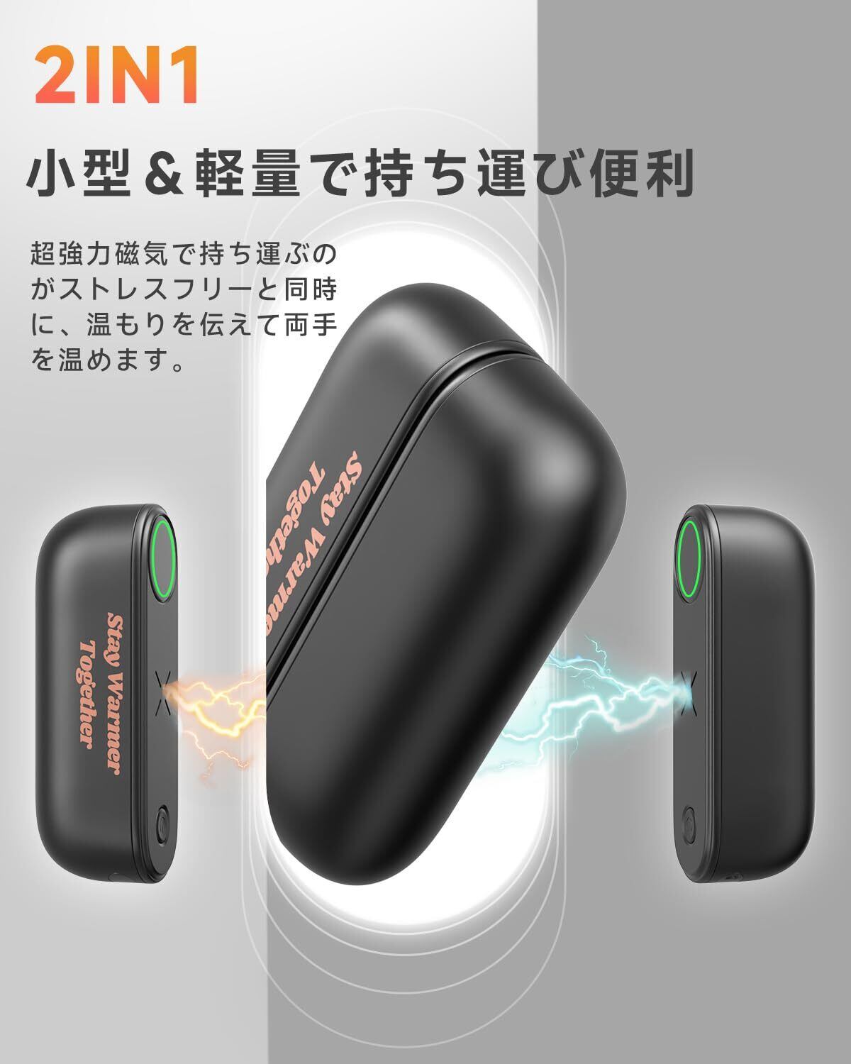 「このカイロは、マグネット分離式デザインを採用しており、持ち運びが非常に便利です。超軽量かつコンパクトな作りなので、通勤やアウトドア、旅行にもぴったり。急速充電が可能で、長時間使用できる大容量10000mAhバッテリーを搭載しているので、持ち歩きながら一日中暖かさを感じられます!」