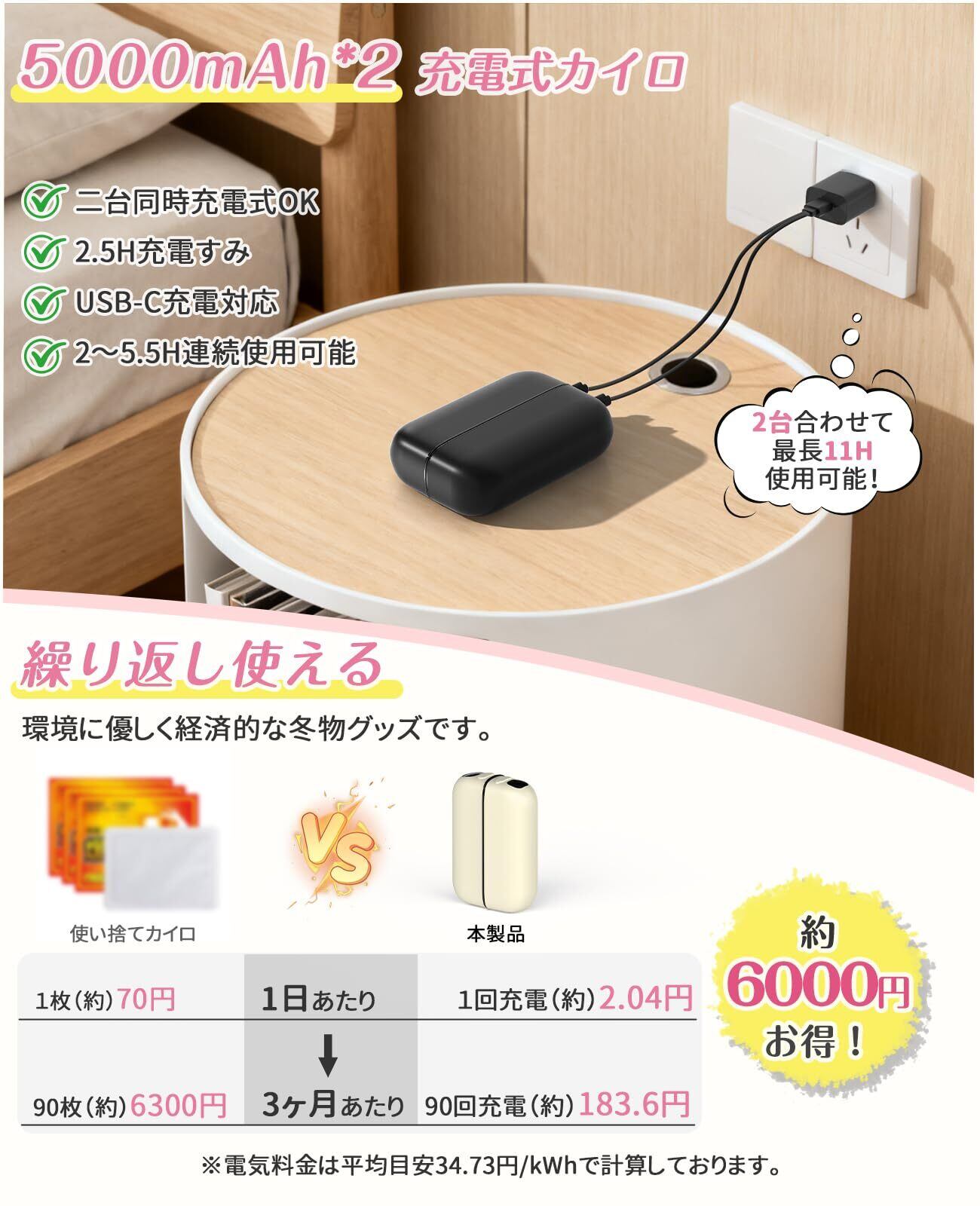 「全体が発熱する設計で、手を包み込むような心地よさを実現。マグネット分離式なので、片手に持って移動する際も安全で、友人や家族とシェアすることも簡単です。軽量で持ち運びも楽々、冬の必需品です!」