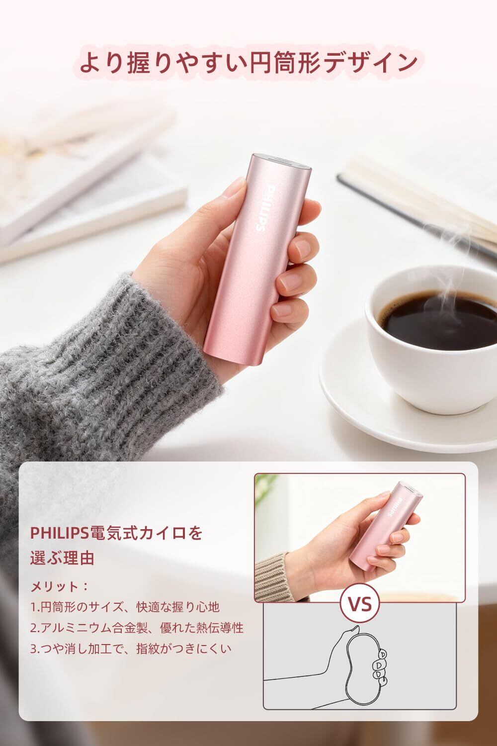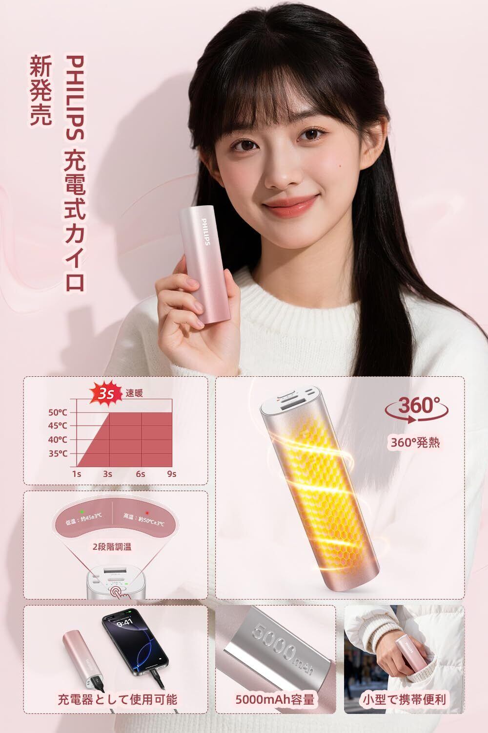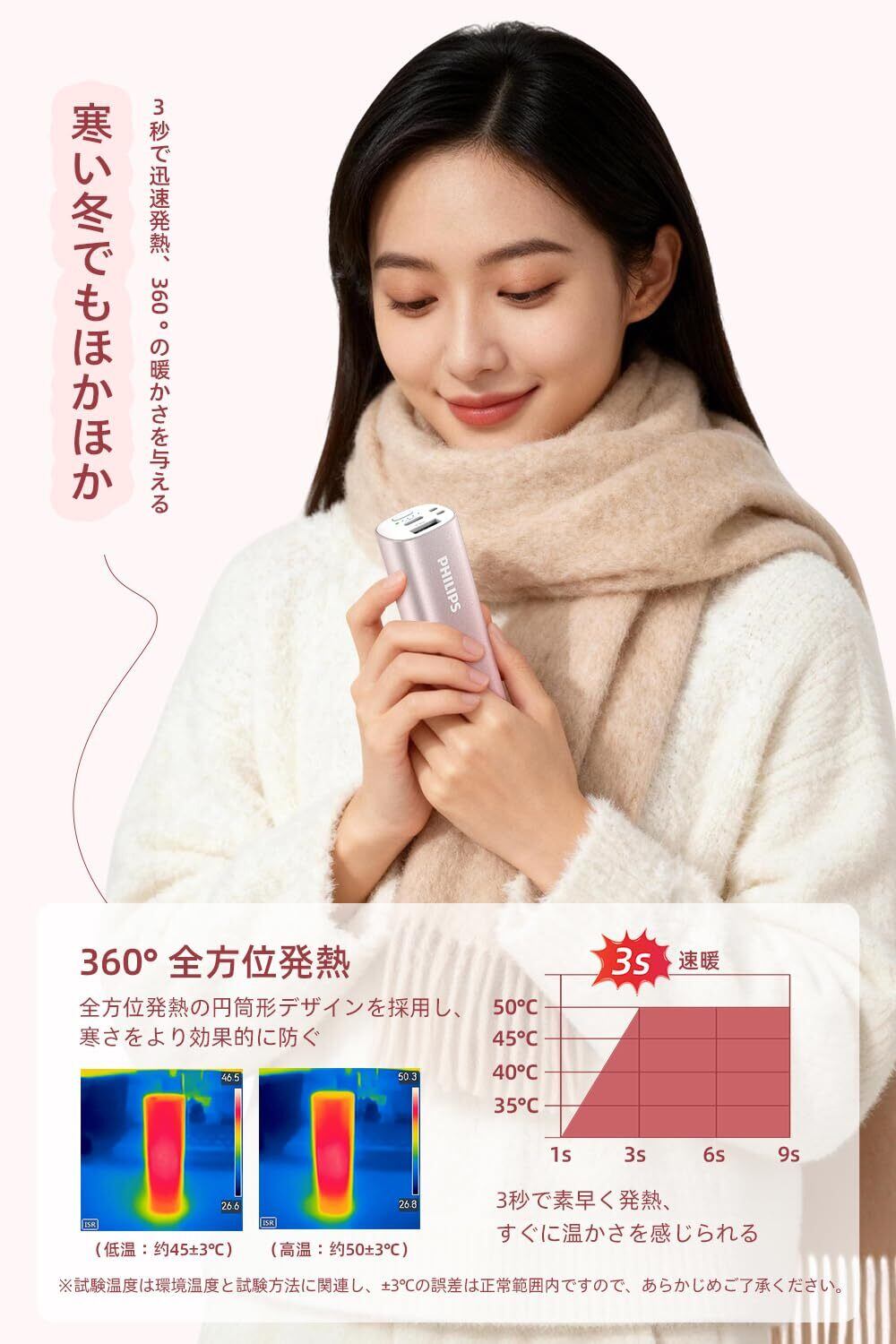 「寒い季節のお伴に、フィリップスの充電式カイロが新登場!360°全方位発熱で、手を包み込むような心地よい温もりを実感できます。薄型・軽量のデザインで、どこへでも気軽に持ち運べるのが魅力です。」