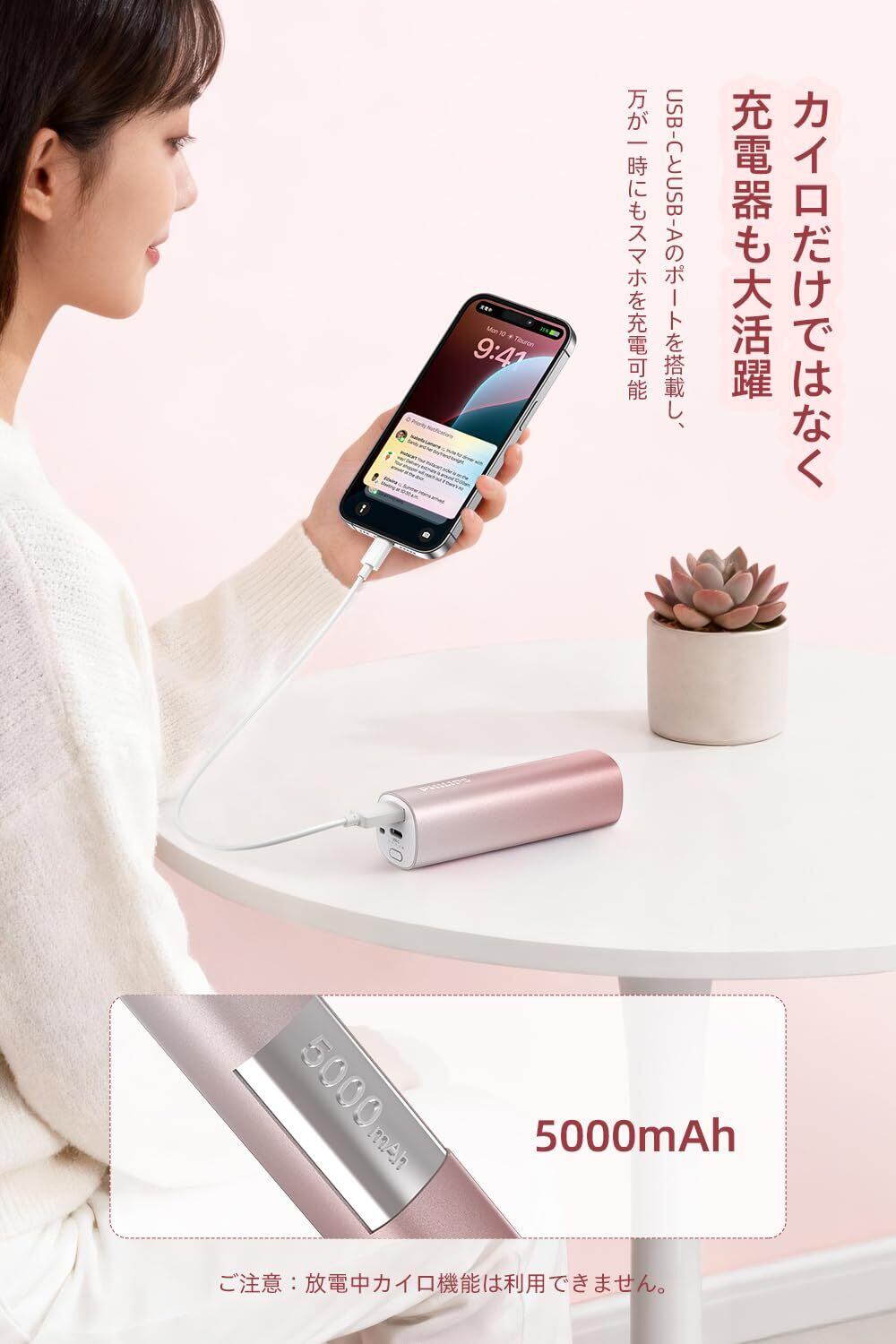 【カイロ&充電器の2in1】 5000mAhのバッテリーを搭載し、usbカイロとしてだけでなくモバイルバッテリーとしても使えます。屋外では防寒、屋内ではスマホへの充電が可能で、とても便利な防寒グッズでございます。※カイロの充電中及び放電中は、加熱機能を使用できませんのでご注意ください。