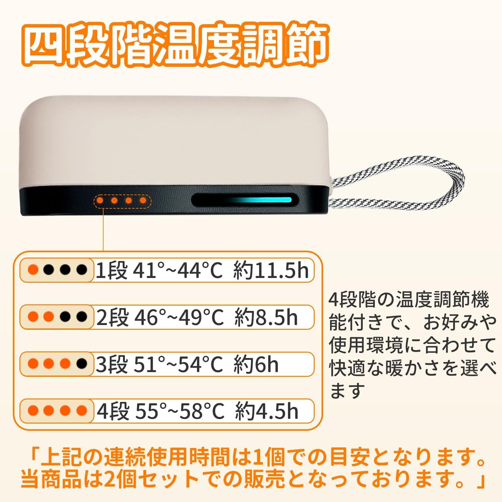 「4段階の温度調節が可能で、自分に合ったぬくもりを選べます。低温(約40-45℃)、中温(約50-55℃)、高温(約60-65℃)、そして新たに加わった快適な温度の4つから選択可能です。」