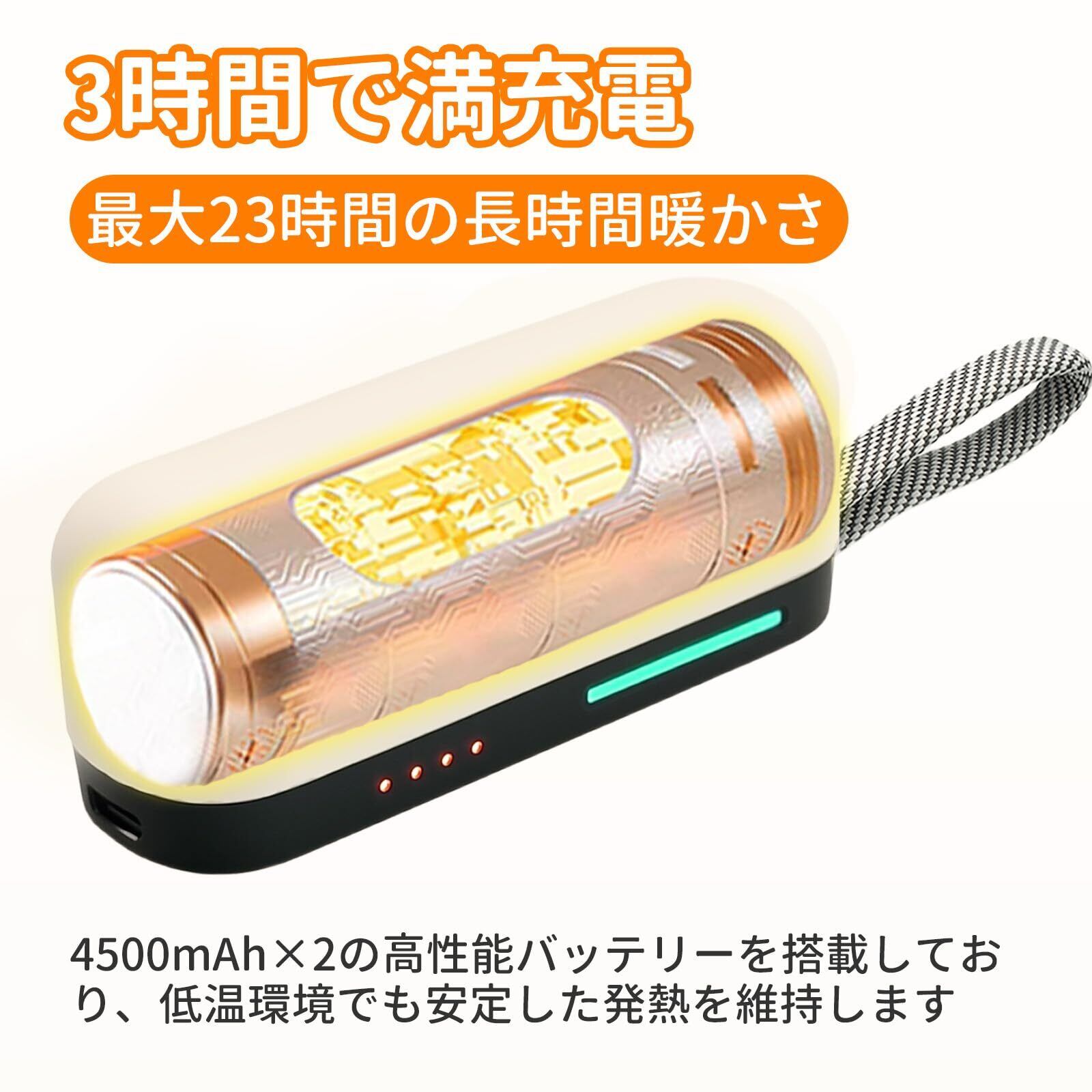 【大容量バッテリーで、最大23時間の切れない温もり】 9000mAh「各4500mAh」の大容量バッテリーを搭載。満充電なら最長23時間「各11.5時間」の連続使用が可能です。朝から夜まで、通勤も通学も旅行も、電池切れの心配なく、ずっとポカポカが続きます。