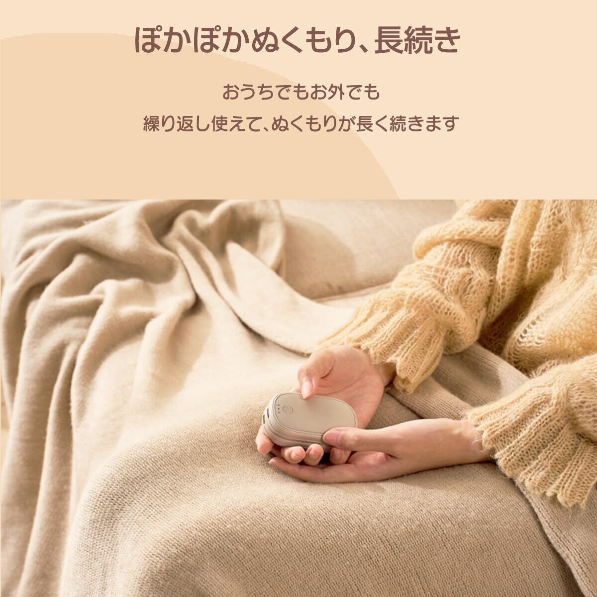 「充電式で、満充電から長時間の連続使用も可能な4000mAhバッテリーを搭載。特に外出時に電池切れの心配がないので、安心してお使いください。温かさをシェアするのもおすすめ!」