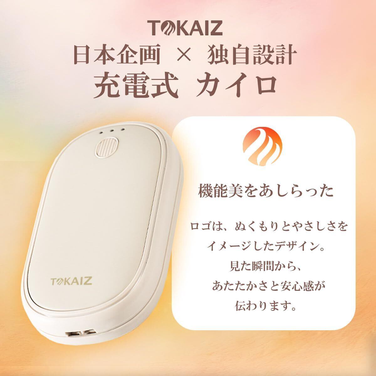 「寒い季節に欠かせない『TOKAIZ 充電式カイロ』が登場!手のひらサイズの可愛らしいデザインながら、強力な温もりをしっかり山って、冬を快適に過ごすための頼れる相棒です。」