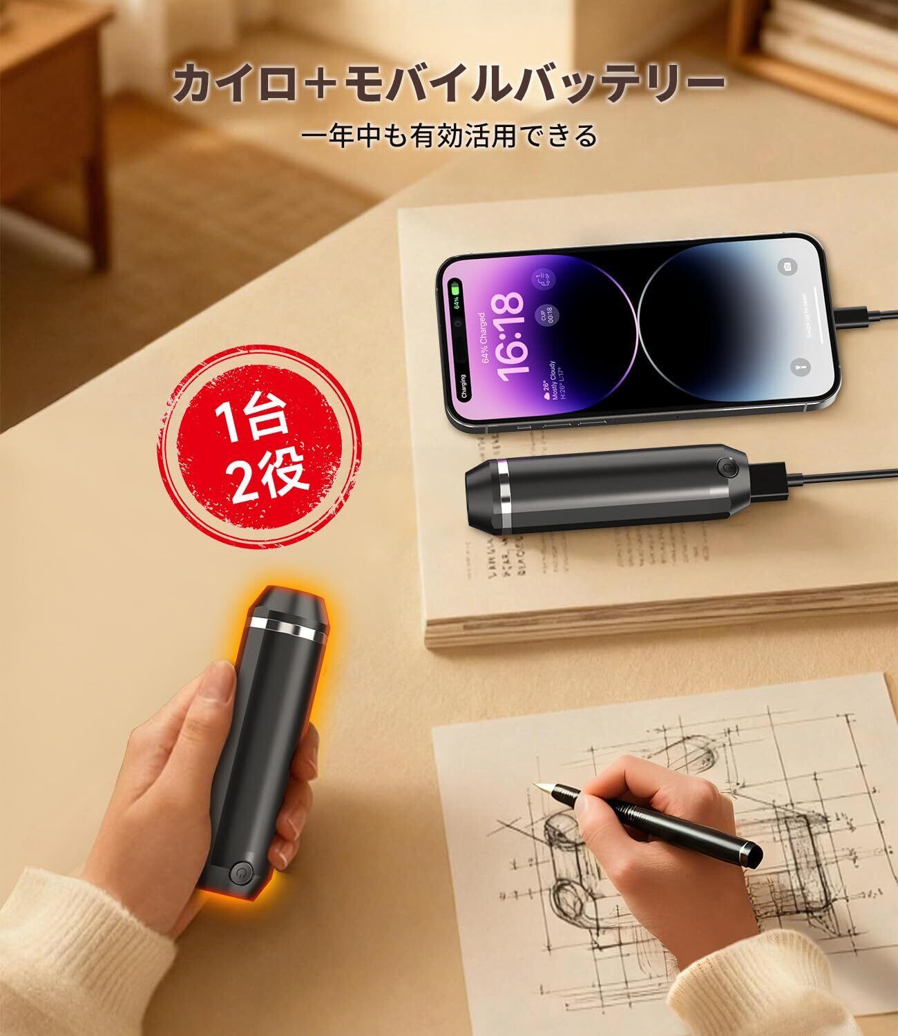 「このカイロは、ハンドウォーマーとしてだけでなく、モバイルバッテリーとしても使用可能な2WAY機能を搭載。スマートフォンの充電にも対応します。」