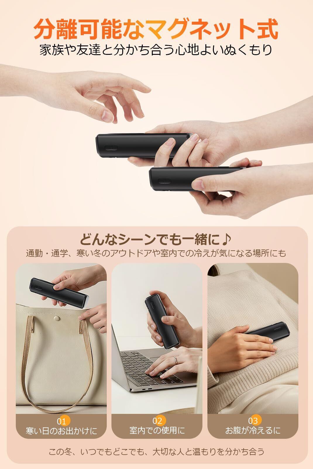 【マグネット分離式デザイン&シェア可能】磁力で2つに分かれる分離式デザインを採用。1人で両手に使うのはもちろん、家族や恋人、友人とシェアして使うことも可能です。さらに、分離式だから使い方も自由自在。通勤・通学・デスクワーク・キャンプ・旅行・ペットとの散歩・スポーツ観戦など、あらゆるシーンで大活躍。2つを重ねて使えば保温力がさらにアップ。冬のギフトにも最適なおしゃれな電気カイロです。