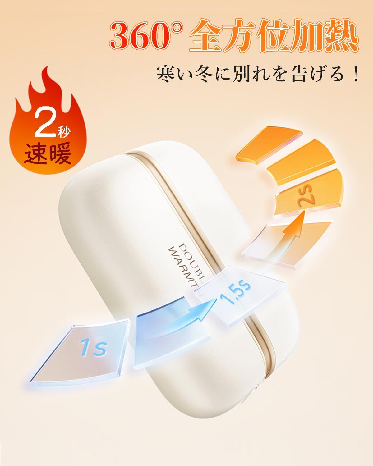 「電源を入れてからわずか2秒で発熱開始!360°全方位から均一に温かさを届け、手全体を包み込むような心地よさを実現します。通勤や旅行、アウトドアでの寒さ対策に最適です。」
