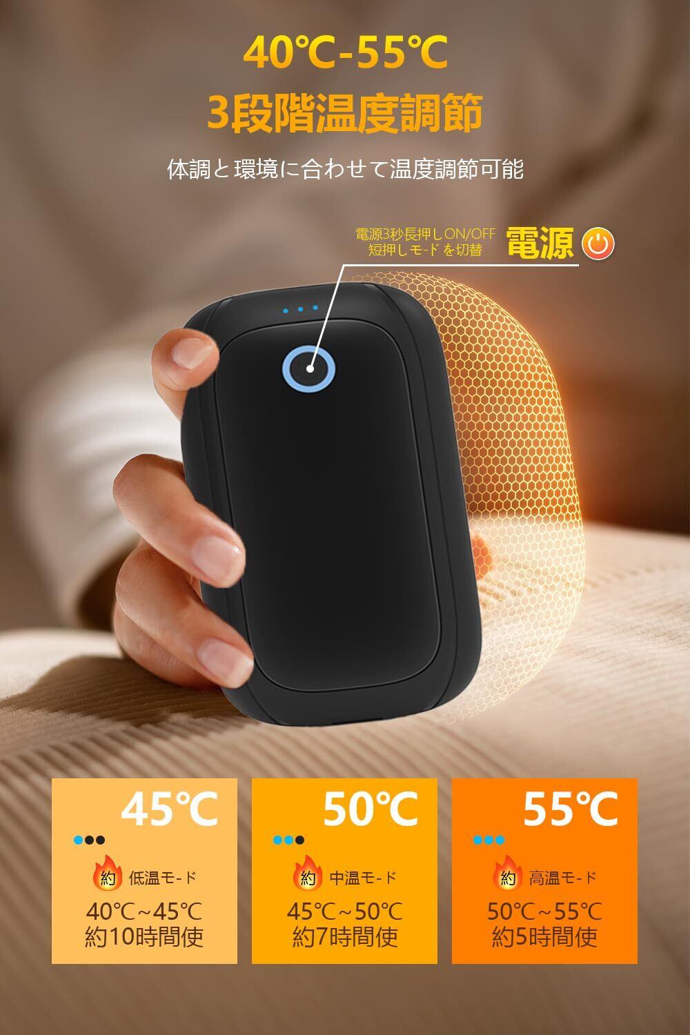 「電源を入れた瞬間、わずか2秒で発熱を開始!寒さから瞬時に解放され、両手を自由に暖められる分離式の設計で、自分のスタイルに合わせた使い方が可能です。友人や家族とシェアすることもでき、特にアウトドアでの使用に便利です。」