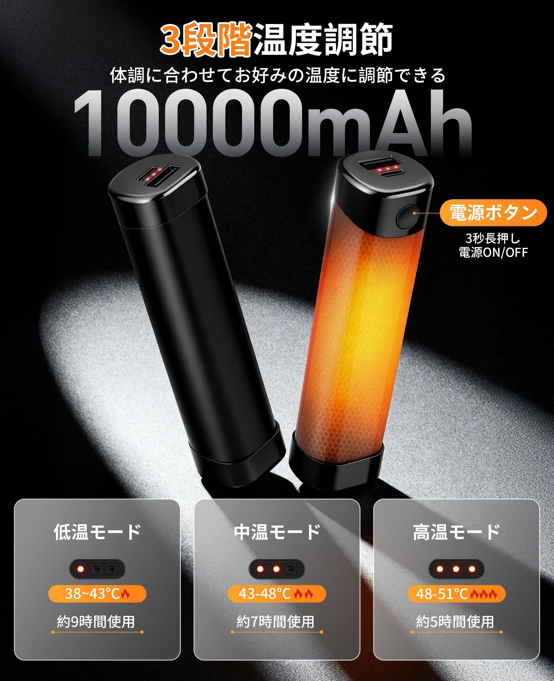 「温度設定は40℃、50℃、60℃の3段階から選べ、ボタン一つで簡単に切り替えが可能です。寒さに合わせた快適な温度調整ができるので、日常の通勤やアウトドア活動にも最適!」