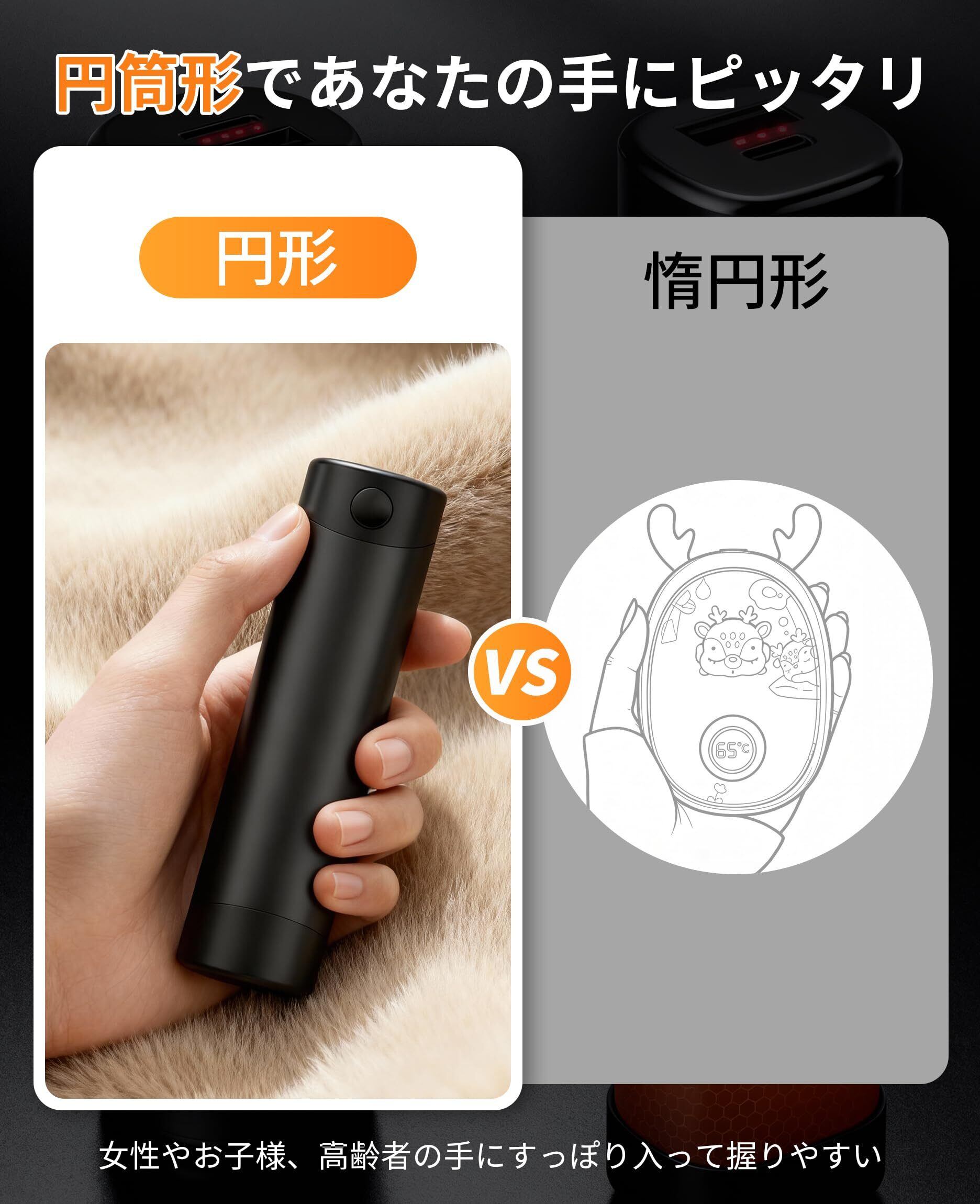 「電源をオンにすると、なんと10秒で温まります。360°全方位から均一に発熱し、手全体を心地よく包み込む温かさを実現。友人や家族とシェアできる分離式デザインで、リラックスした時間を一緒に楽しめます。」