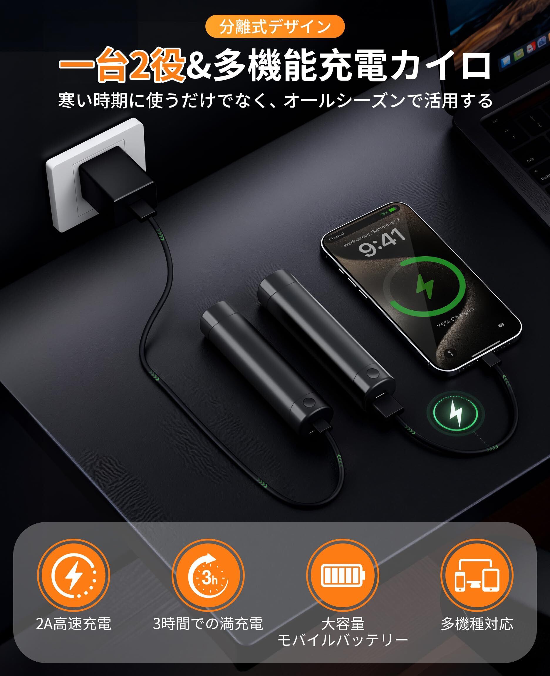 【マグネット分離式デザイン・2個セット】本ハンドウォーマーは革新的な分離式デザインを採用し、ワンボタン操作だけで簡単に取り外し可能です。2台を組み合わせて手のひらサイズの1つの充電式カイロとして使え、別々にして2台の電気カイロとしても使える。通勤時は両手で包み込むように、作業中はポケットに分けて入れながら――あなたの生活スタイルに合わせて自由に組み合わせられます。充電式だからエコで経済的、いつでもすぐに使える安心の暖かさがあなたを包みます。寒い朝の通学通勤にぴったり、手が冷たいあなたは冬の間ずっと暖かく保つことができます。