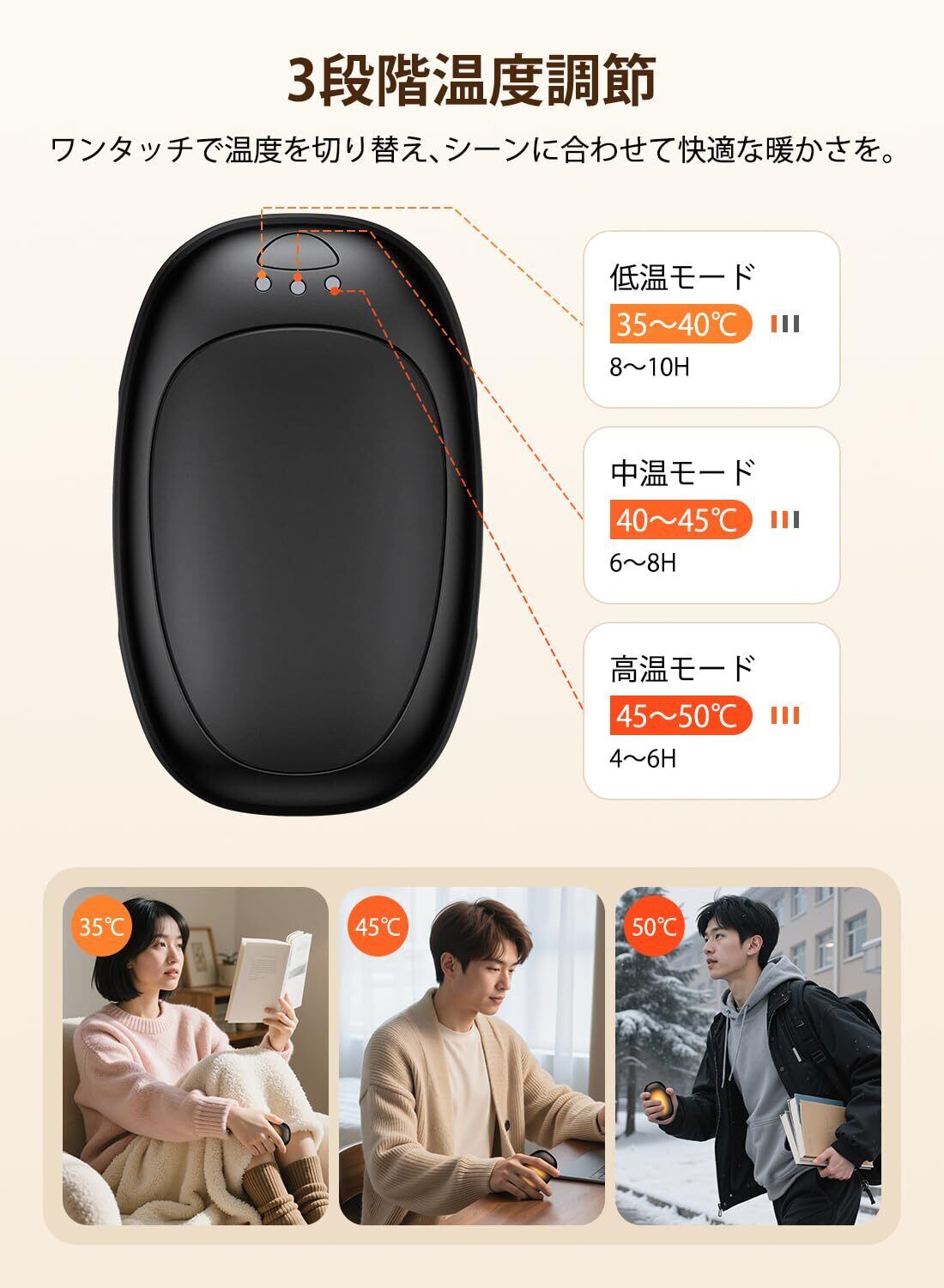 「このカイロは、38-43℃の低温から、48-51℃の高温までの3段階調節が可能。寒い日の通勤や友人とのアウトドア活動の際でも、あなたにぴったりの温度を選び、快適なひとときをお楽しみいただけます!」