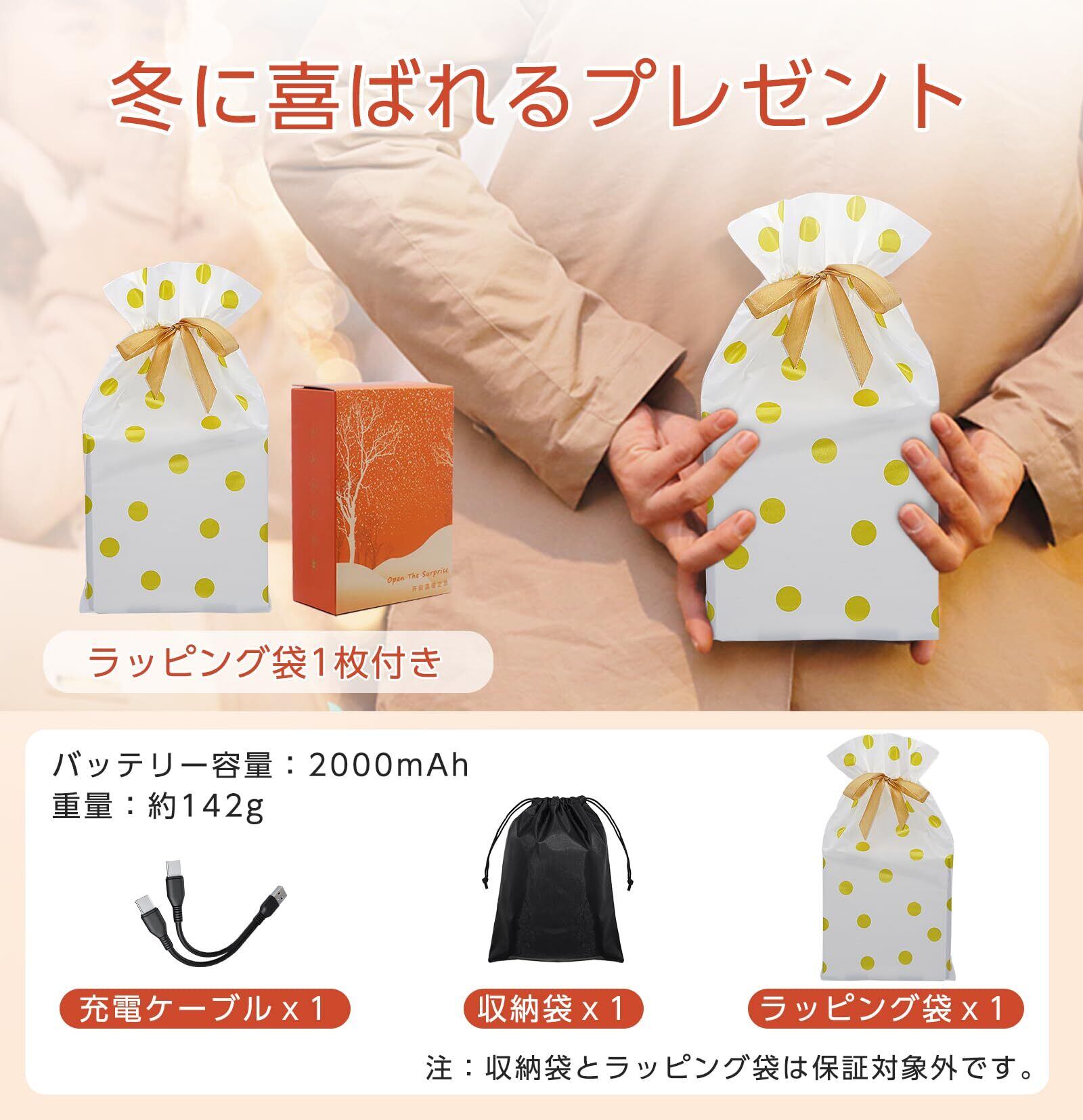 「2000mAhの大容量バッテリー内蔵により、1.5~3時間の連続使用が可能です。USB充電が可能なので、家でも外出先でも簡単に充電でき、いつでも温かさをキープ。冬の寒さをしっかりと防いでくれます。」