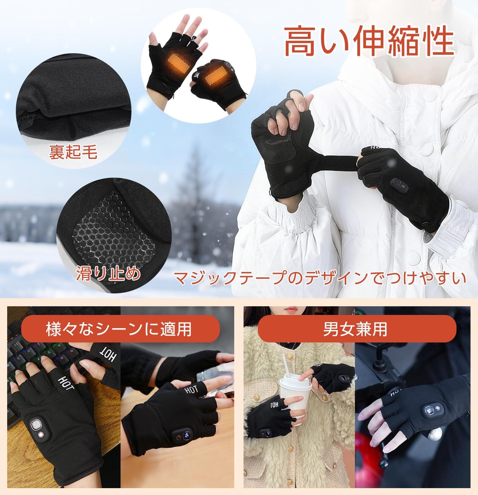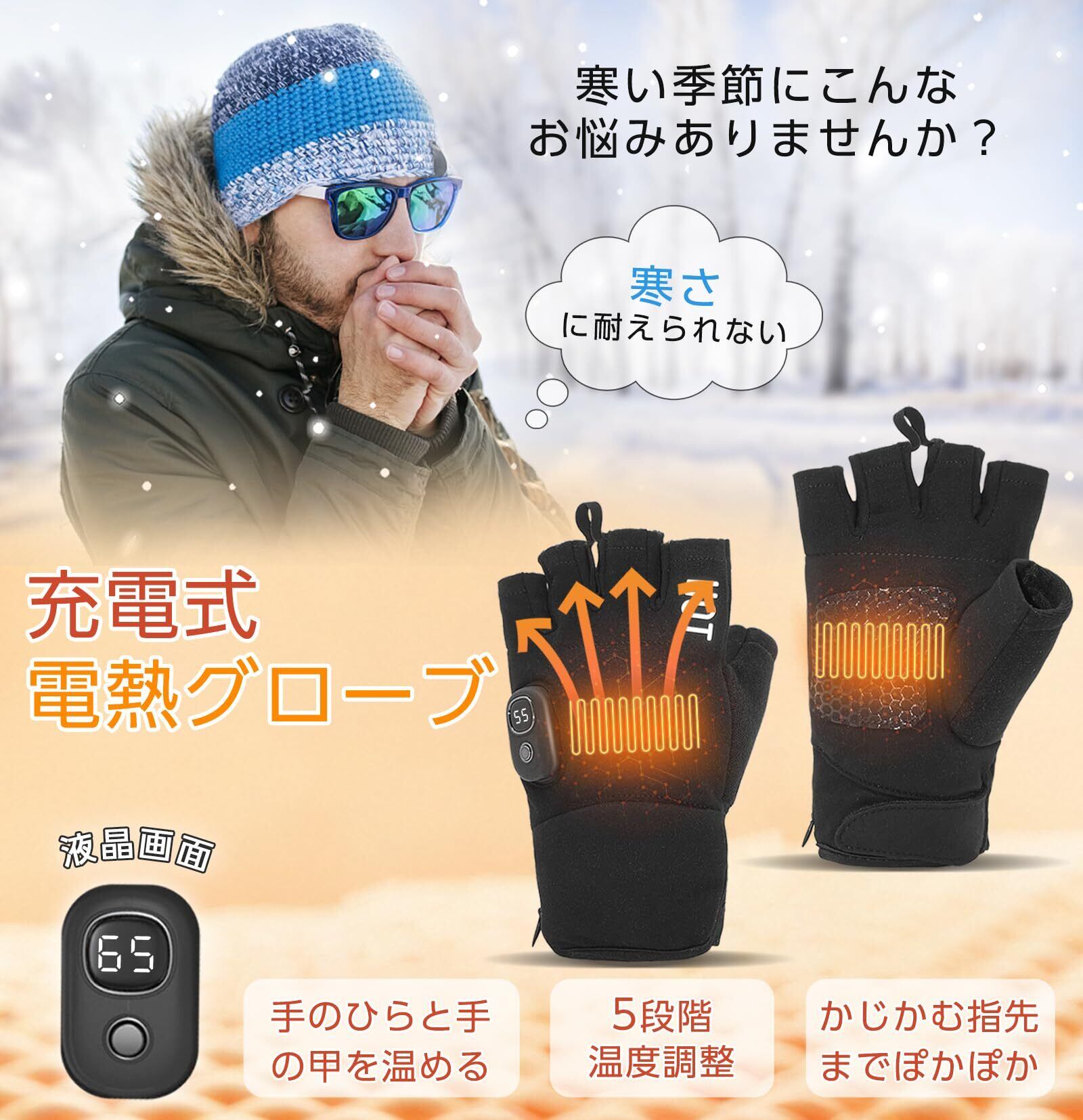 「寒い季節の必需品『電熱グローブ』が登場!この手袋はUSB接続による加熱機能を搭載し、温かさを素早く提供します。指なしデザインで快適さと使いやすさを兼ね備えています。」