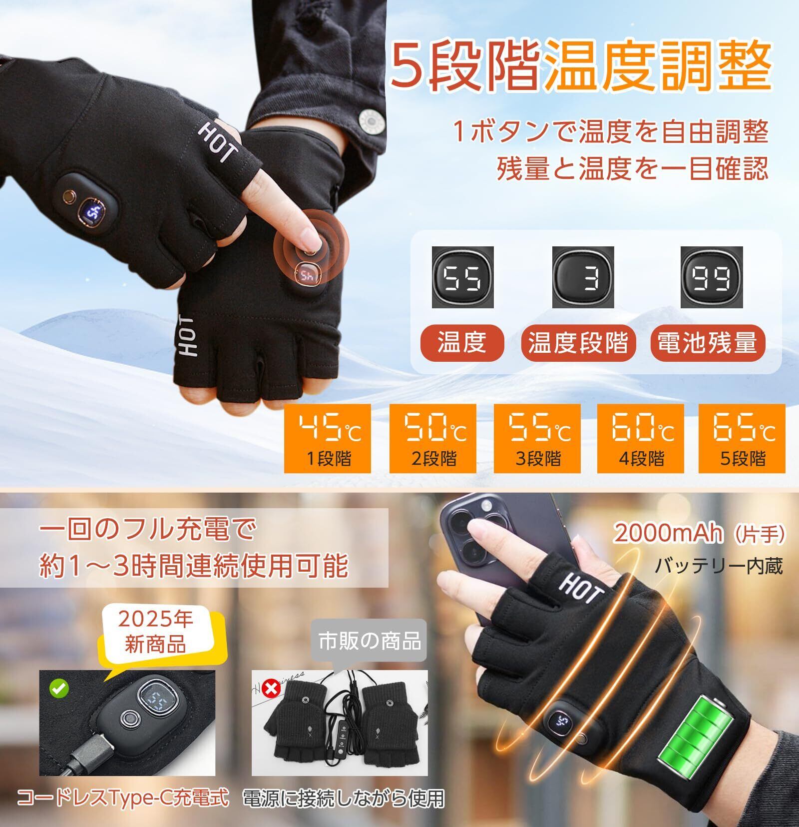 **電熱グローブ 電熱手袋 ヒーター手袋 指なし 2000mAh USB充電 5段温度調整 LEDディスプレイ ハンドウォーマー ヒーターグローブ パソコン作業 男女兼用 フリーサイズ 通勤 通学 CT267**