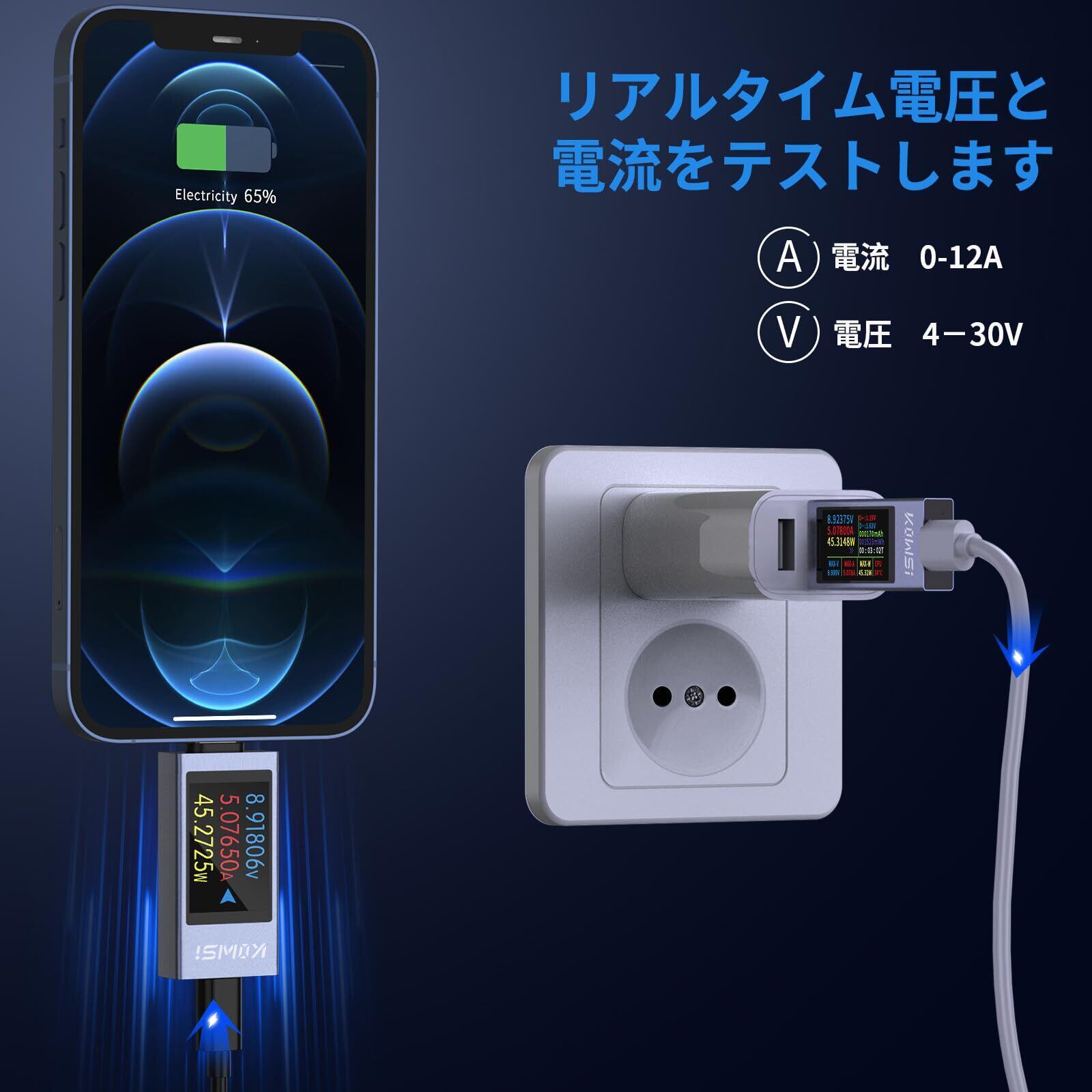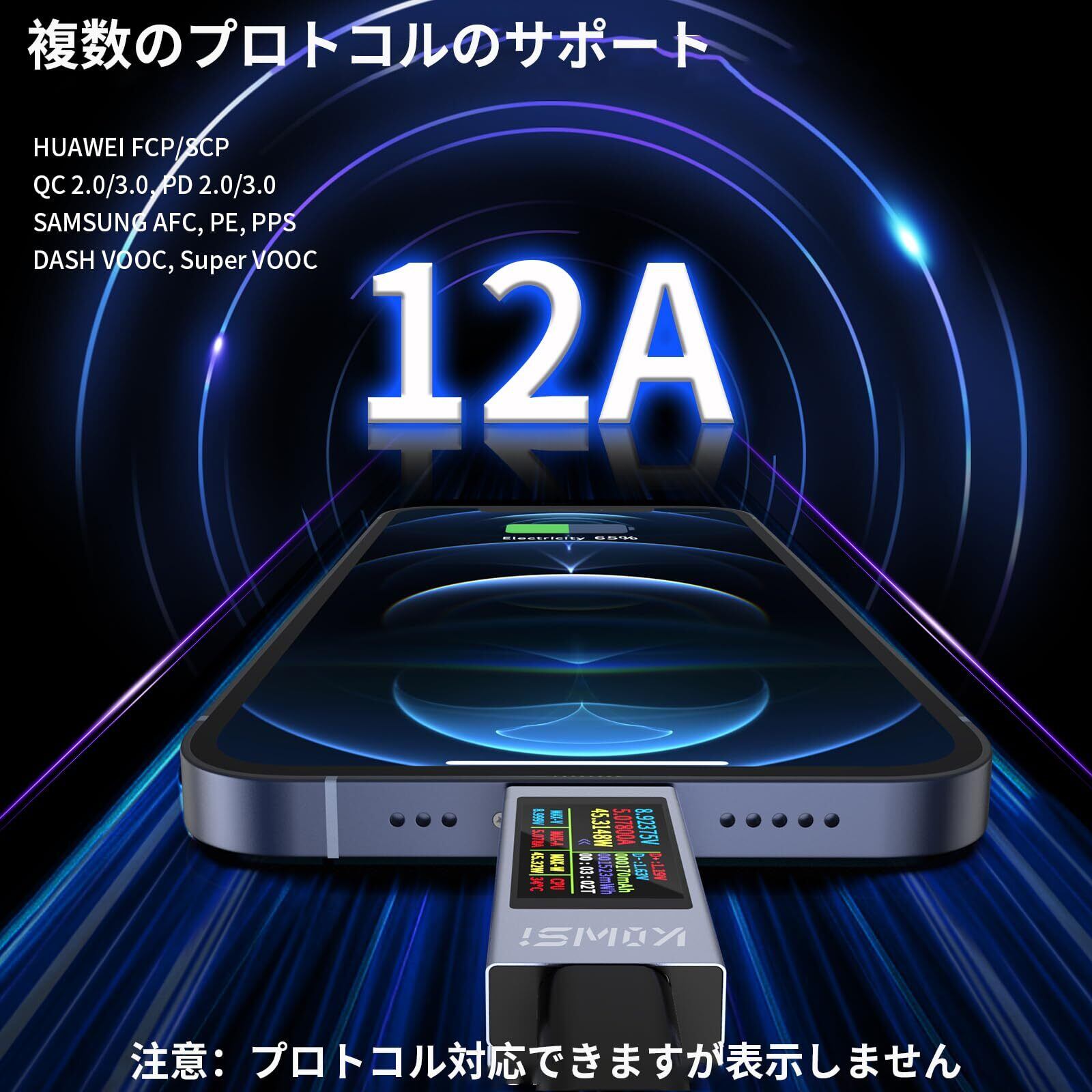「このデジタルマルチメーターは、電圧(4-30V)、電流(0-12A)、電力(0-360W)、および容量を測定できます。PD(Power Delivery)規格に対応しており、さまざまなデバイスの充電状況を一目で確認できます。」