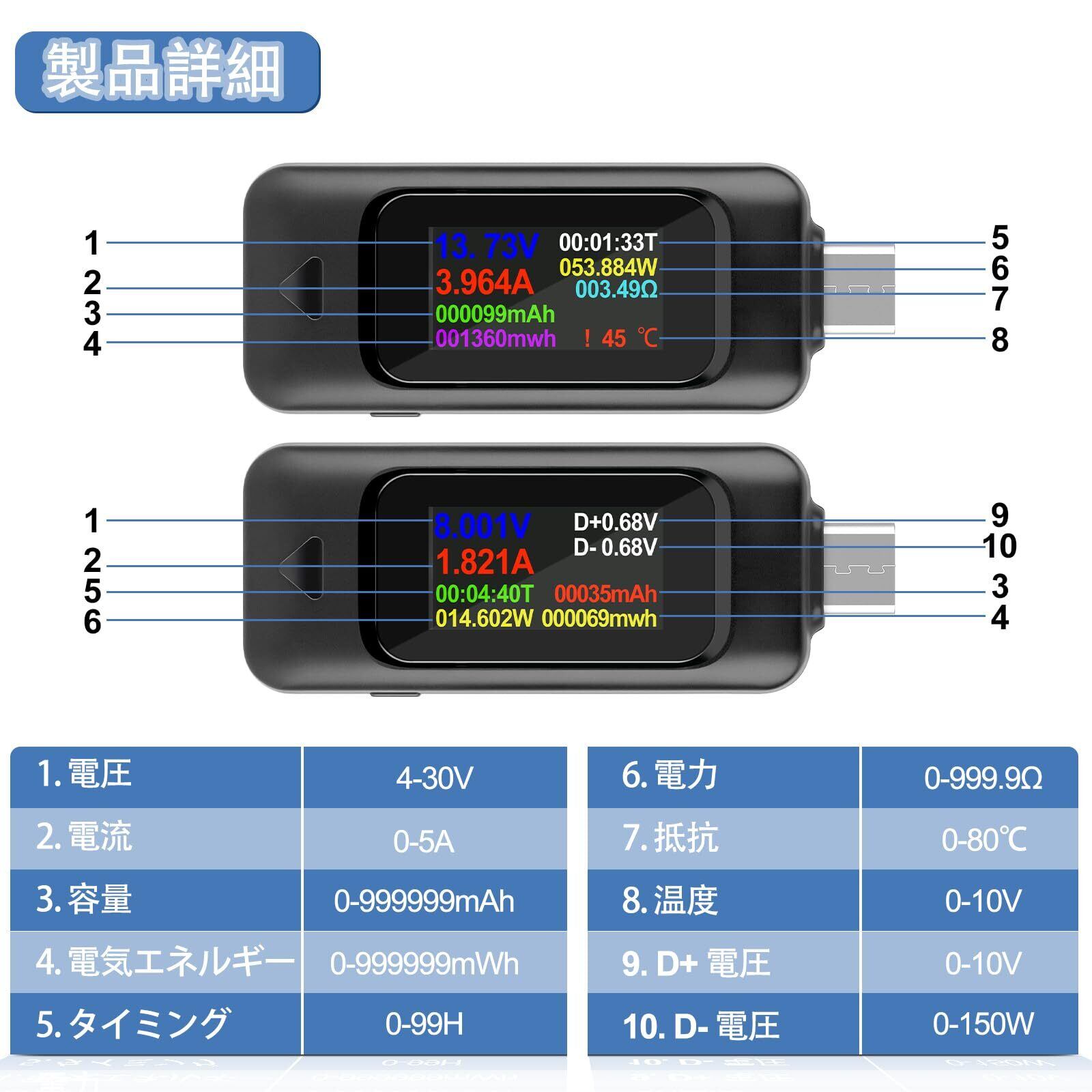 電流 電圧チェッカー、Type-C USBテスター 4-30V 電圧電流チェッカー USBマルチメーター 0-5.1A USBパワーメーター多機能テスターディスプレイ容量電圧電流検出器