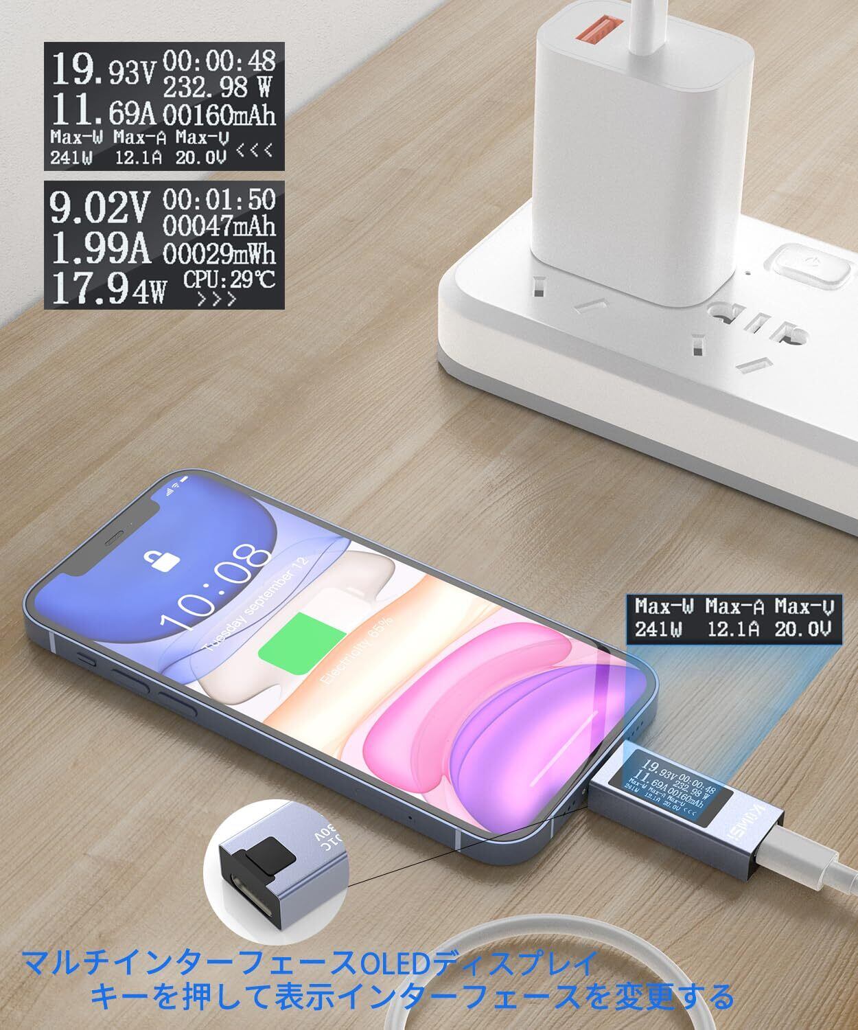 【Type-C電流電圧チェッカー】このUSBテスターはUSBCデバイスの電圧・電流・通電方向・通電時間・ワット・内部温度を簡単にチェックできる装置です。