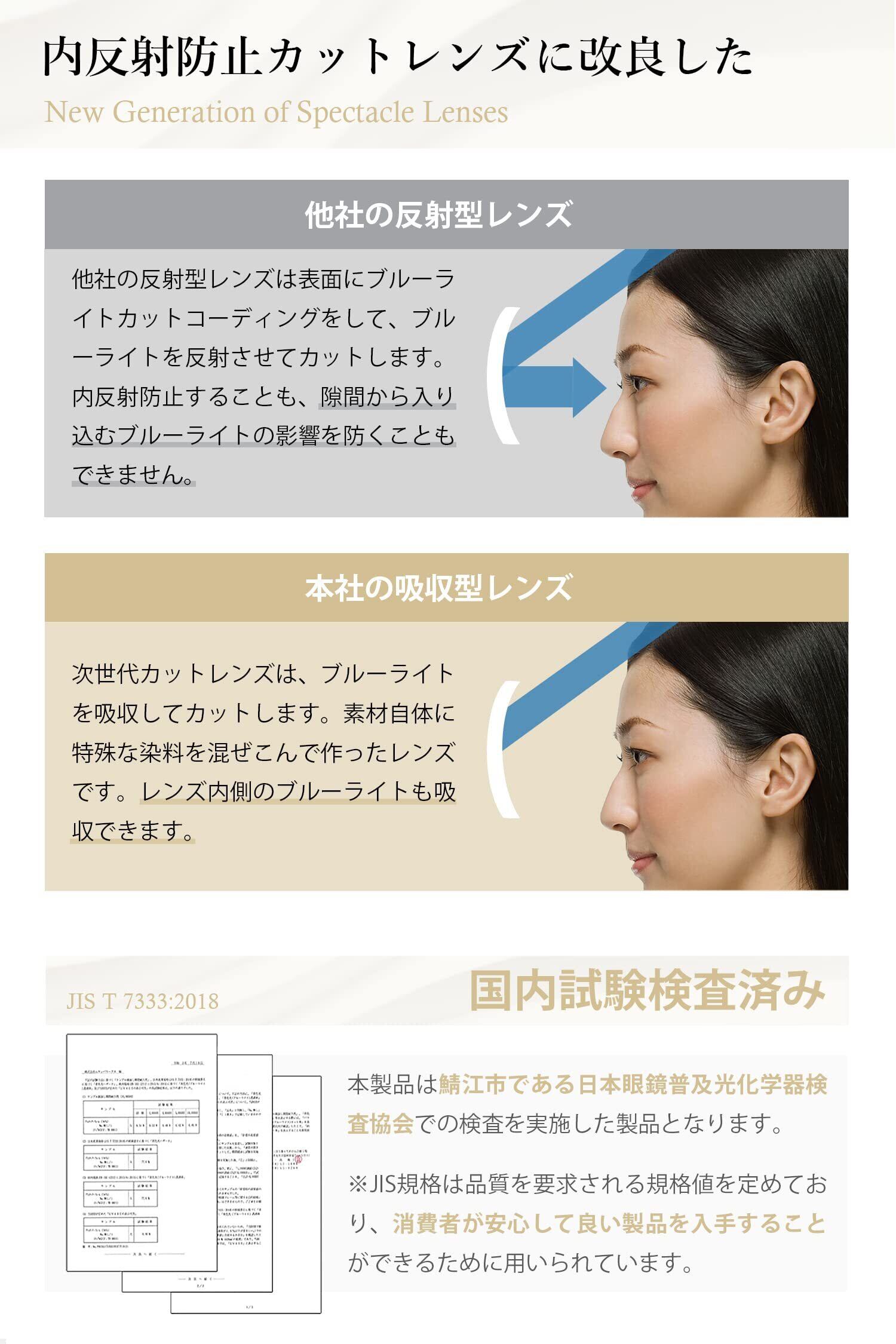 【JIS規格検査済み製品】本製品は日本眼鏡普及光学器検査協会での検査を実施した製品となり、ブルーライト・HEV・UVカット率はが測定されています。※JIS(日本産業)規格は品質を要求される規格値を定めており、消費者が安心して良い製品を入手することができるために用いられています。