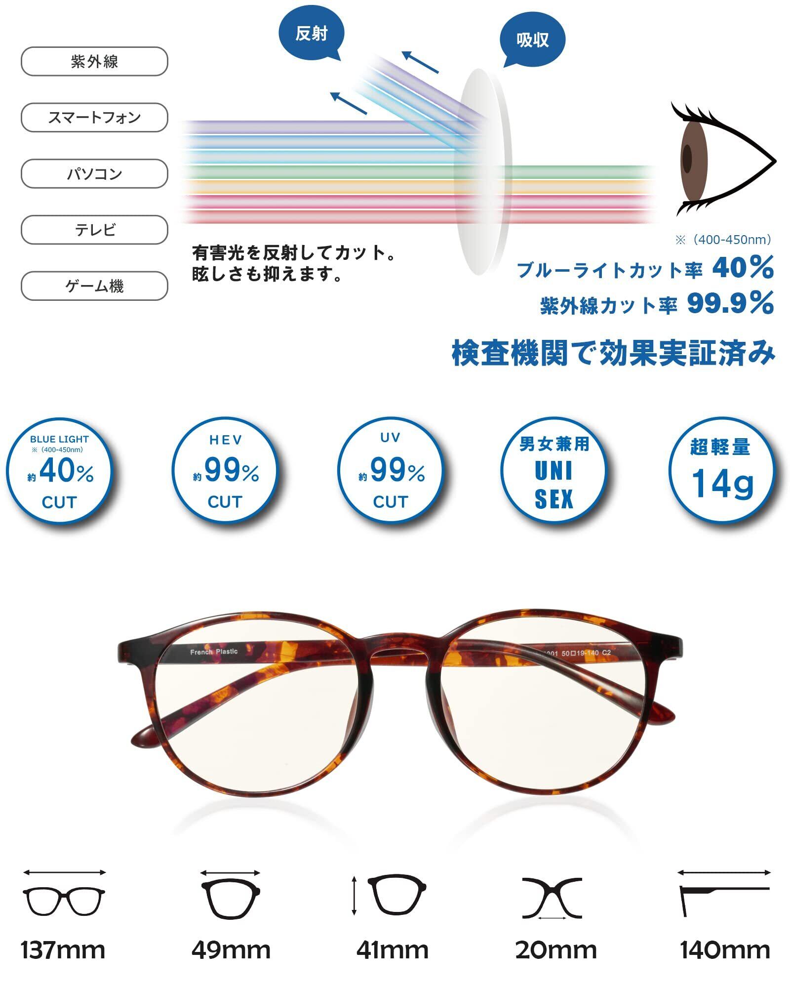 【素材構成】 『フレーム素材』:超軽量弾力「FRENCH PLASTIC G850」 『鼻パッドの形状』:フレーム一体型 『レンズ』:高品質プラスチック/ブルライトカット率40%/UVカット率99%/HEVカット率99%
