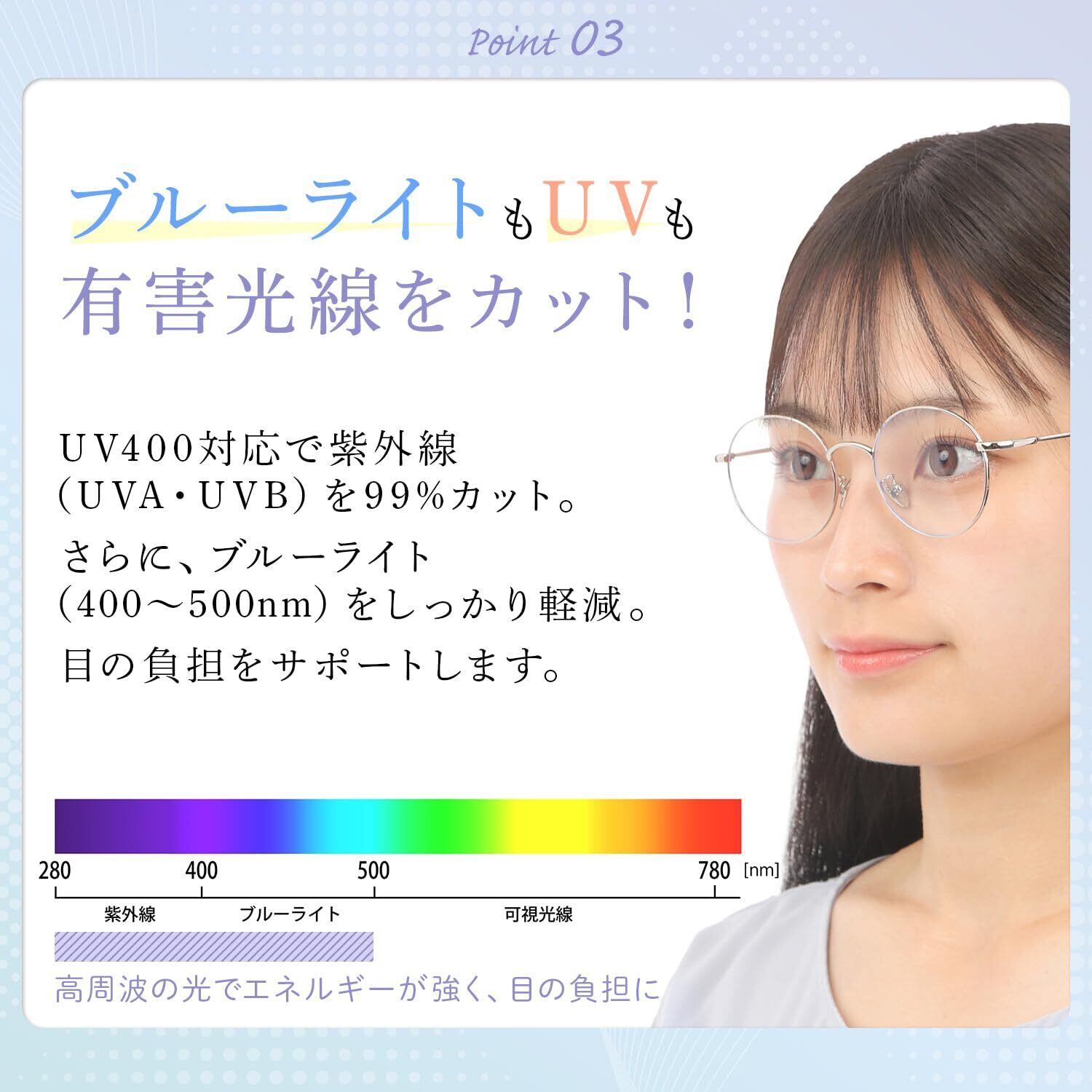 UV400対応で紫外線(UVA・UVB)を99%カット。さらに、スマホやパソコンなどデジタル機器の画面から発せられるブルーライト(400〜500nm)をしっかり軽減し、目の負担をサポートします。