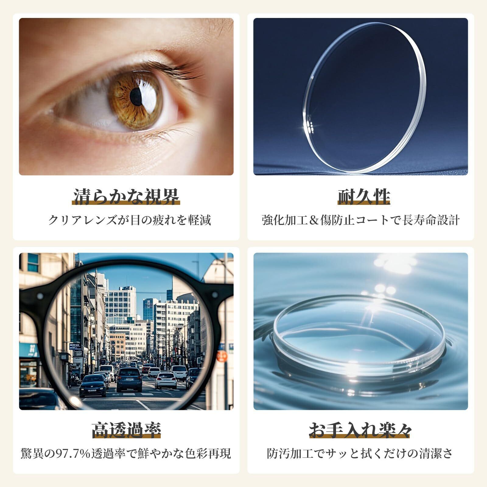 歪みのないクリアな視界►この眼鏡は、高精度なレンズを使用しており、視野の端から端まで鮮明でクリアな視界を提供します。これにより、長時間の読書やコンピュータ作業でも、視界のブレや歪みがなく、快適に集中することができます。さらに、レンズの表面には特別なコーティングが施されており、反射やグレアを効果的に抑え、目にかかる負担を最小限に抑えます。