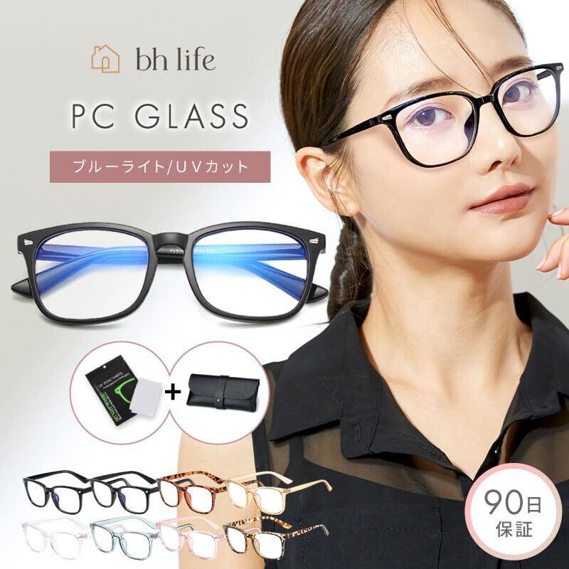 [bh life] ブルーライトカットメガネ PC眼鏡 UVカット ブルーライト パソコン 度なし 伊達メガネ スマートグラス 軽量 レディース メンズ 紫外線カット ケース付き おしゃれ ウェリントン 黒 黒縁