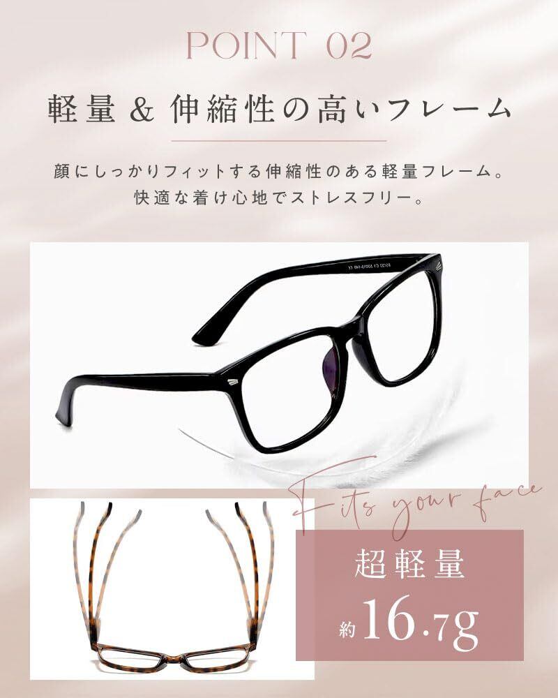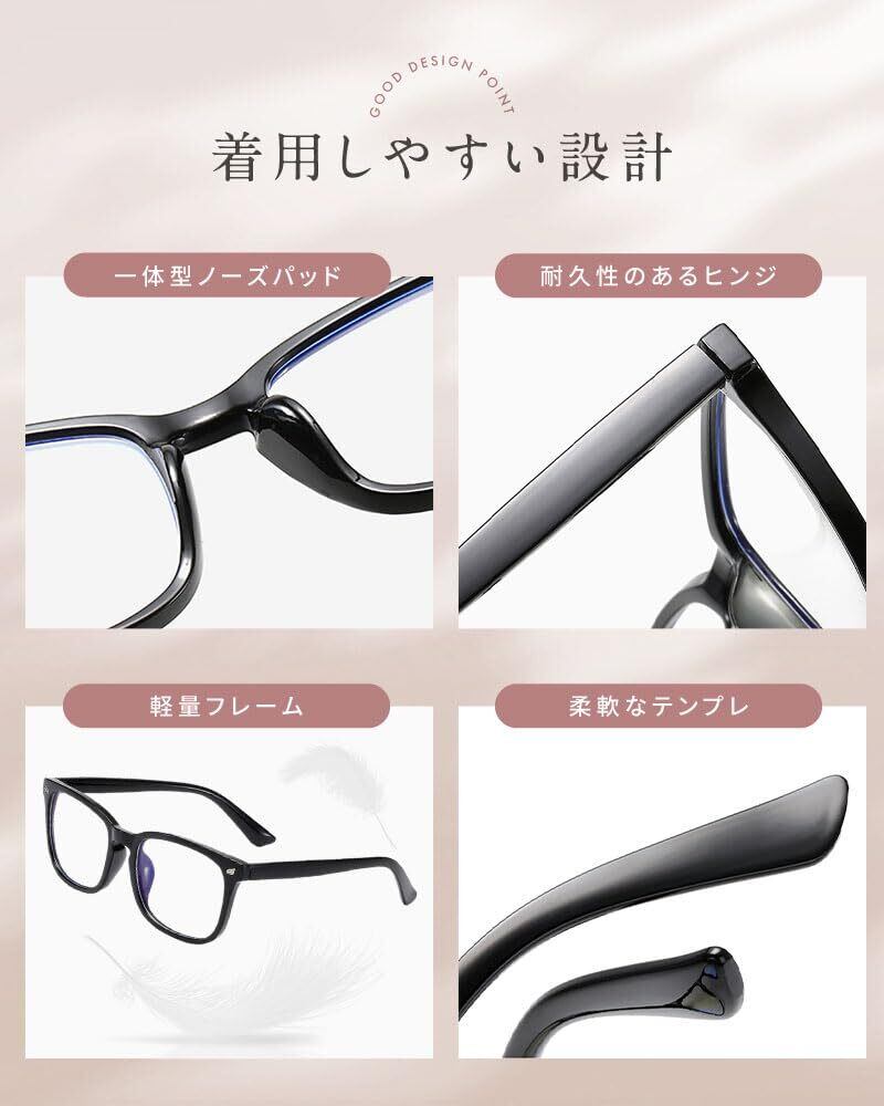 「軽量設計により、長時間の使用でも負担を感じません。耳や鼻への圧迫も少なく、デイリーにお使いいただくのにぴったりのアイテムです。快適な掛け心地で、仕事や勉強に集中できる環境を整えます。」