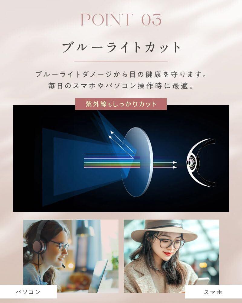 「パソコンやスマホから発せられるブルーライトを効果的にカットすることで、目の疲れを軽減します。働く方や長時間デジタルデバイスを使用する方には特におすすめです。」