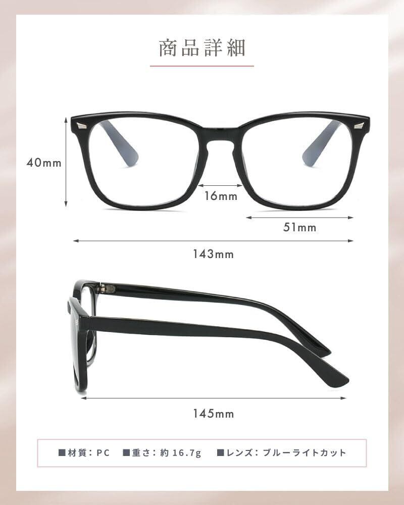 材質:PC、重さ:約16.7g、レンズ:ブルーライトカット