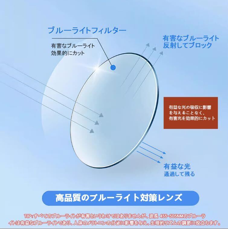 「パソコンやスマートフォンから発せられるブルーライトを効果的にカットし、目の疲れを軽減します。長時間のデジタルデバイス使用でも目の健康を守り、快適なデジタルライフをサポートします。」