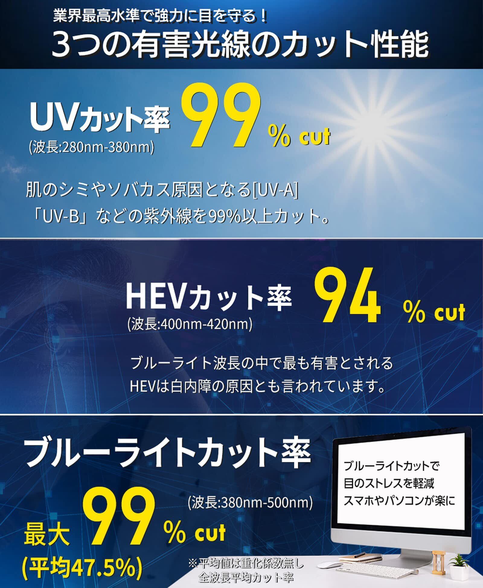 【ブルーライト&紫外線をカット】目に悪影響を与えるとされる有害光線をカット!ブルーライト最大99%、UV99%以上カットし目と健康を守ります!