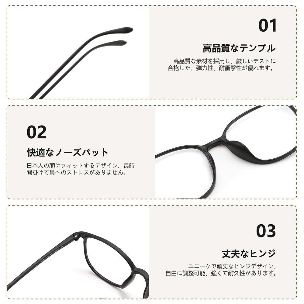 上質なTR90素材:軽量なTR90素材を採用して、長時間の着用しても痛くなりにくく、鼻や耳への負担を軽減 します。更に、柔軟性や耐久性を兼ね備えて、肌触りもよくて、快適なフィット感をご提供しております