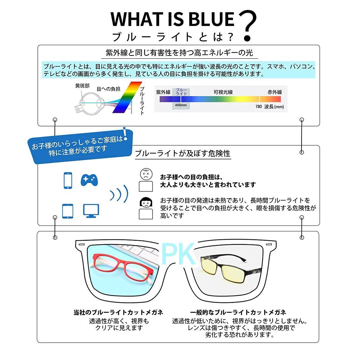 「このメガネは、パソコンやゲーム機から発せられるブルーライトをしっかりとカットし、長時間の使用による目の疲れを和らげる機能が備わっています。特にデジタルデバイスを多く使用するお子様の視力保護に役立つ頼もしいアイテムです。」