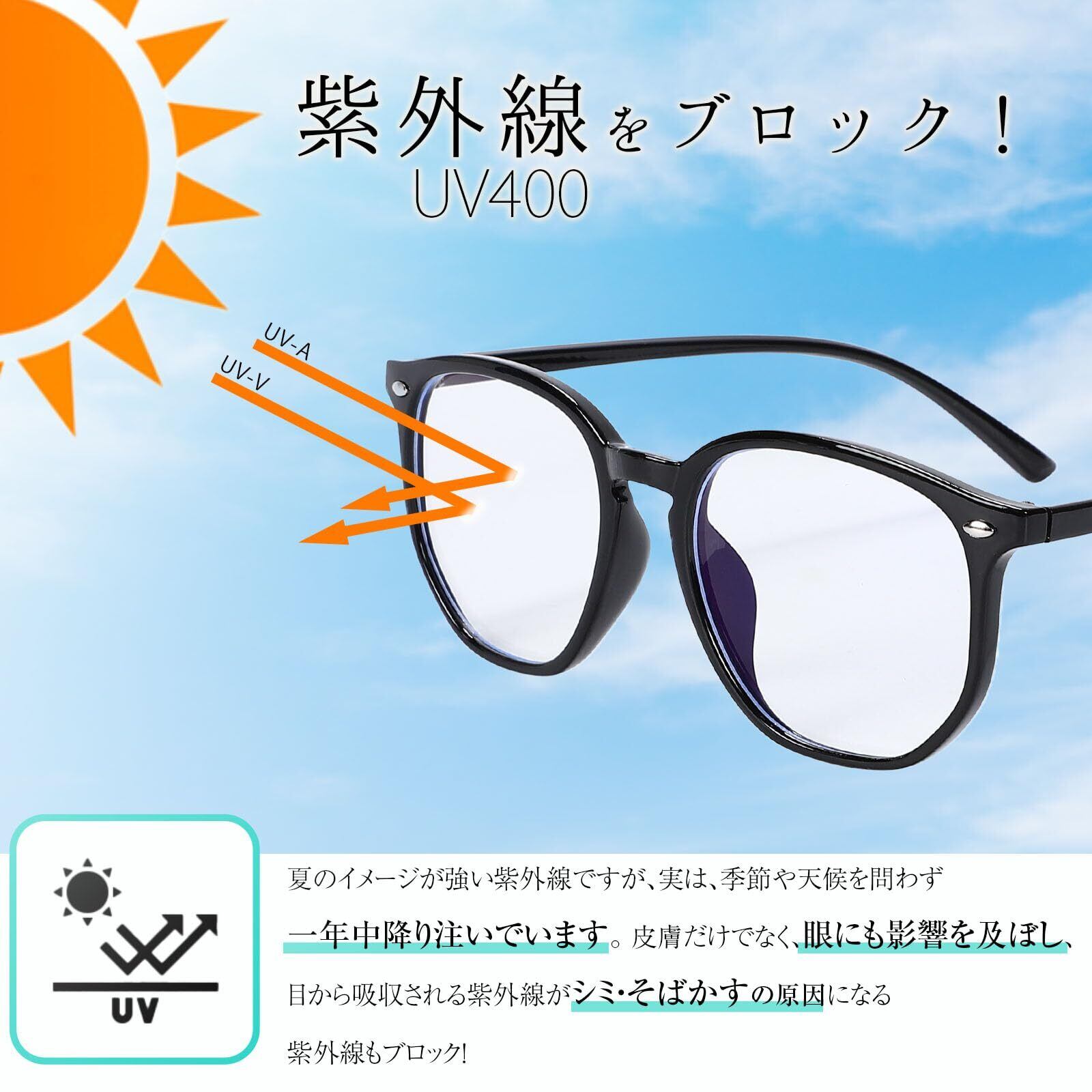 【ブルーライト&UV400カット】 ブルーライトレンズだけだはなく、更に紫外線をカットし、目から吸収される紫外線がシミ・そばかすの原因になる紫外線もブロックします。