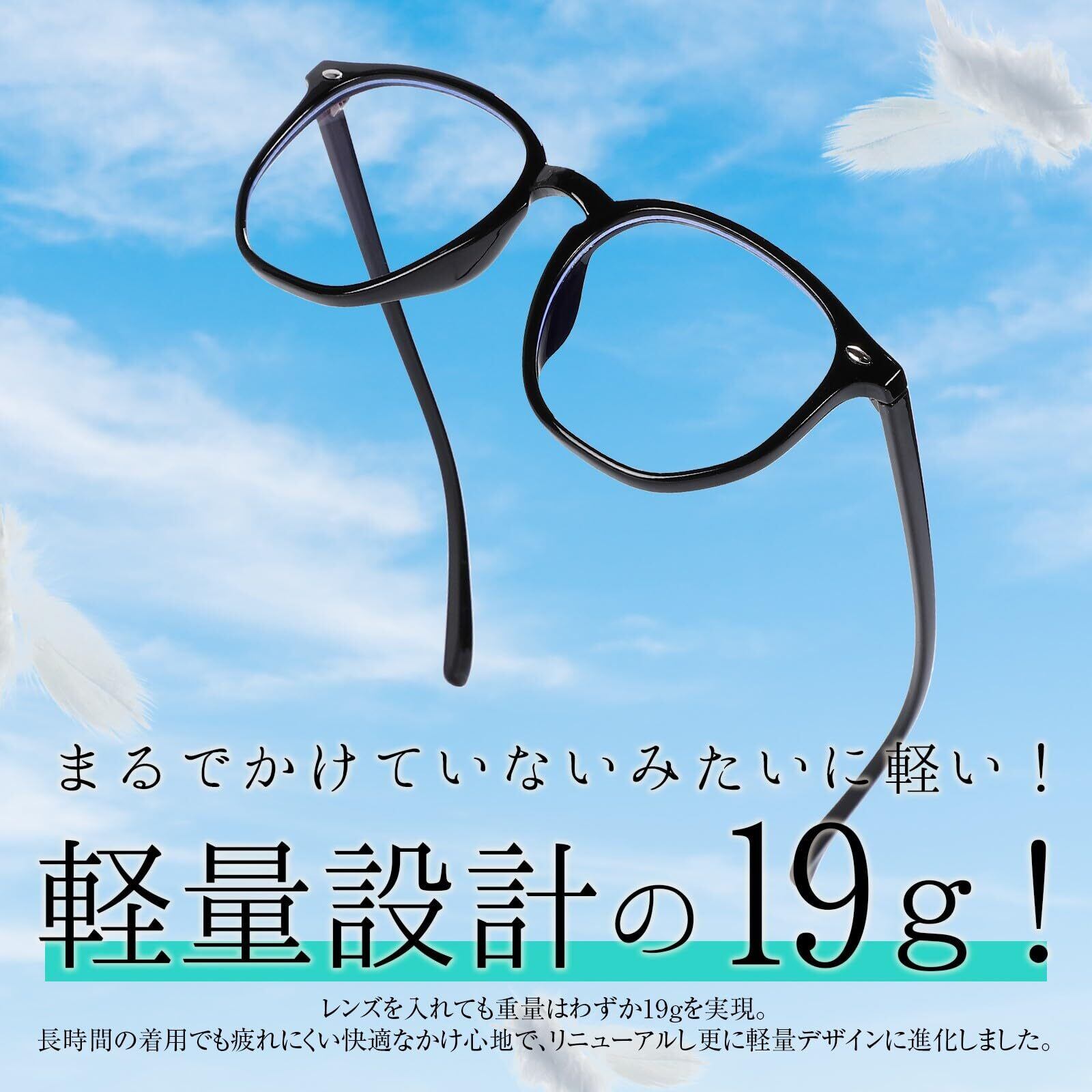 【超軽量 伊達メガネ】 レンズを入れても重量はわずか19gを実現!人間工学に基づいたデザインで、頭部への締め付けを与えず、まるで着けていることを忘れてしまうような感覚、長時間の着用でも疲れにくい快適なかけ心地。
