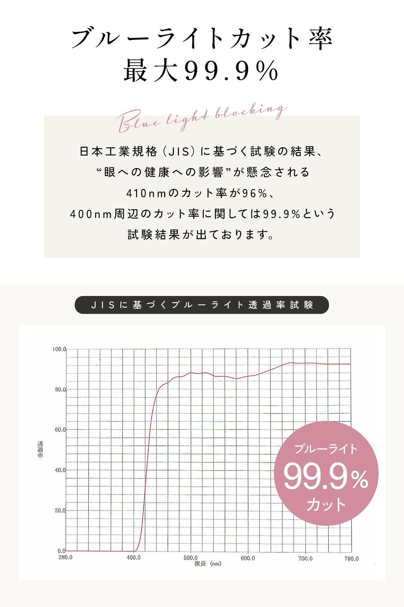 【ブルーライトカット率最大99.9%】 日本工業規格(JIS)に基づく試験の結果、 ”眼への健康への影響”が懸念される400nmのカット率が99.9%、410nmのカット率が96%という試験結果が出ております。 UVカット率は99.9%カット 紫外線カットの効果も期待できるので、紫外線対策としてもお使いいただけます。