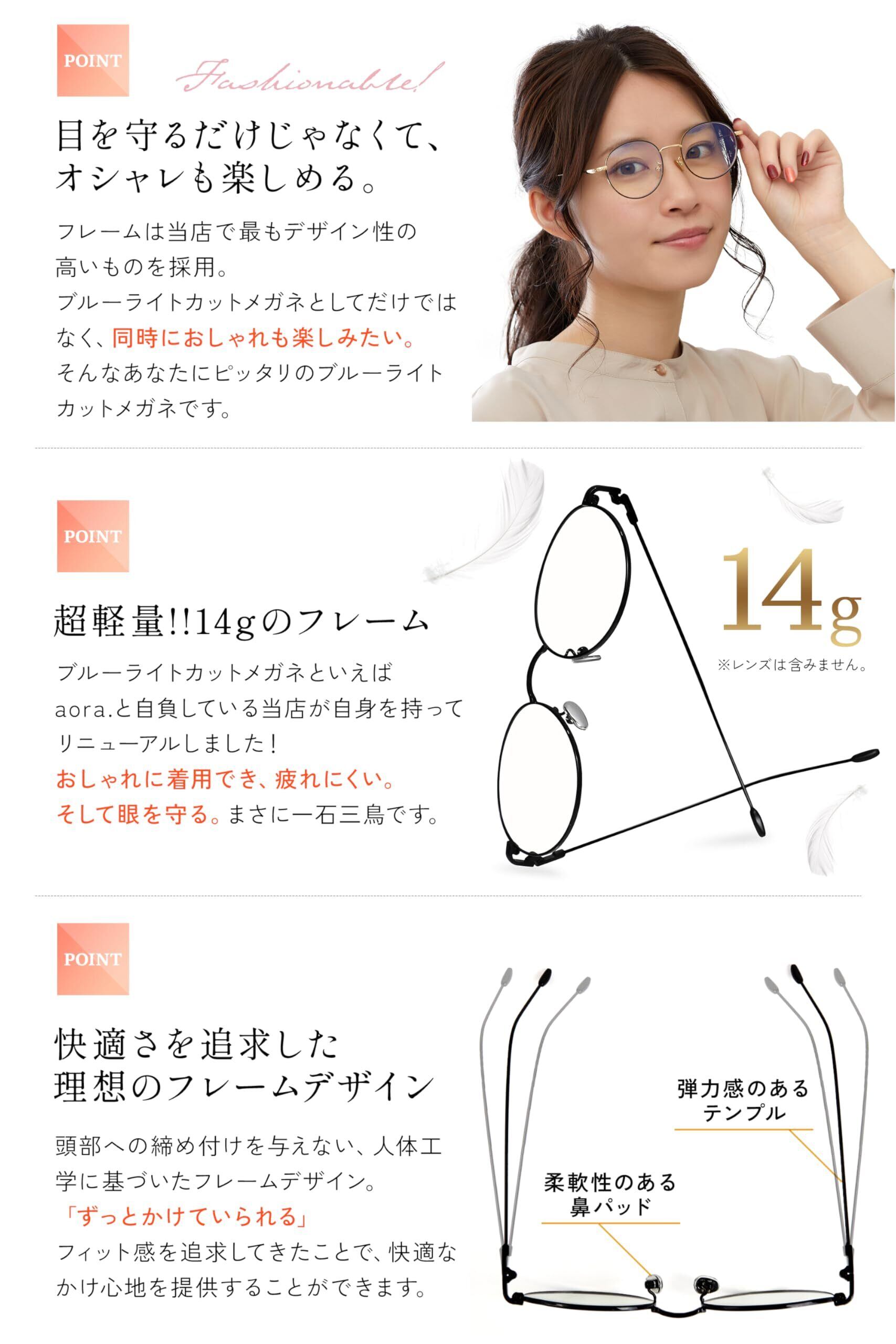 「このメガネは、目へのダメージを軽減するために設計されています。特に長時間パソコン作業やスマホを使用する方にとって、目の疲れを軽減し、快適な視界を提供します!」
