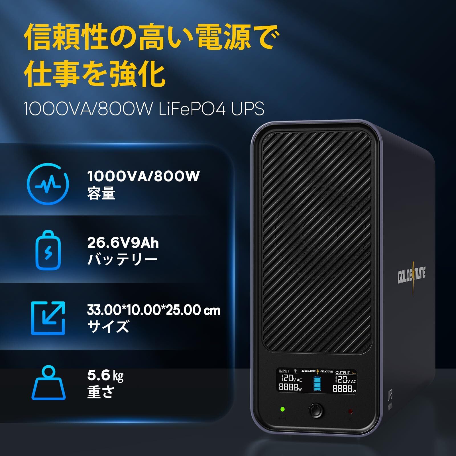 「『GOLDENMATE』の無停電電源装置 UPS 1000VA Proは、ネットワーク機器や通信システムを守るために設計された高機能モデルです。800Wの出力を誇り、リン酸鉄リチウムイオン電池を搭載することで、安全で長寿命な電源供給を実現。停電時にも重要なデータをしっかりと保護します!」