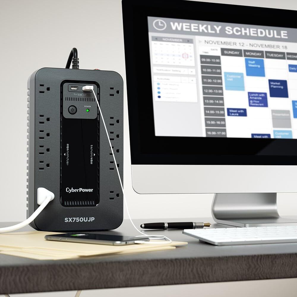 「『CyberPower SX750UJP』は、家庭や小規模オフィスに最適な無停電電源装置です。750VA(450W)の高出力により、大切なデバイスを確実に守ります。常時商用給電機能を搭載しており、突然の停電時でも安心して使用できます!」