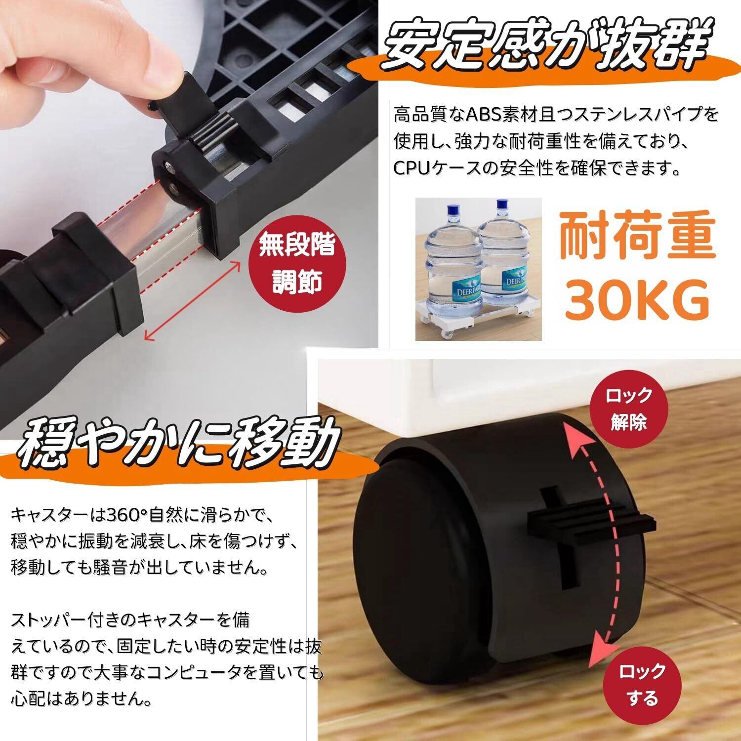 【ストッパー付きキャスター】高品質なABS素材を使用し、強力な耐荷重性を備えており、コンピューターケースの安全性を確保します。PCだけでなく、重い観葉植物をラクラク移動できる。固定したい時の安定性は抜群ですので大事なコンピュータを置いても心配はありません。キャスターが付いていると重いPCでも楽に移動ができ、さらに掃除やメンテナンスもできるからです。良好な強度、良い靭性、そして長い間使用することができます。