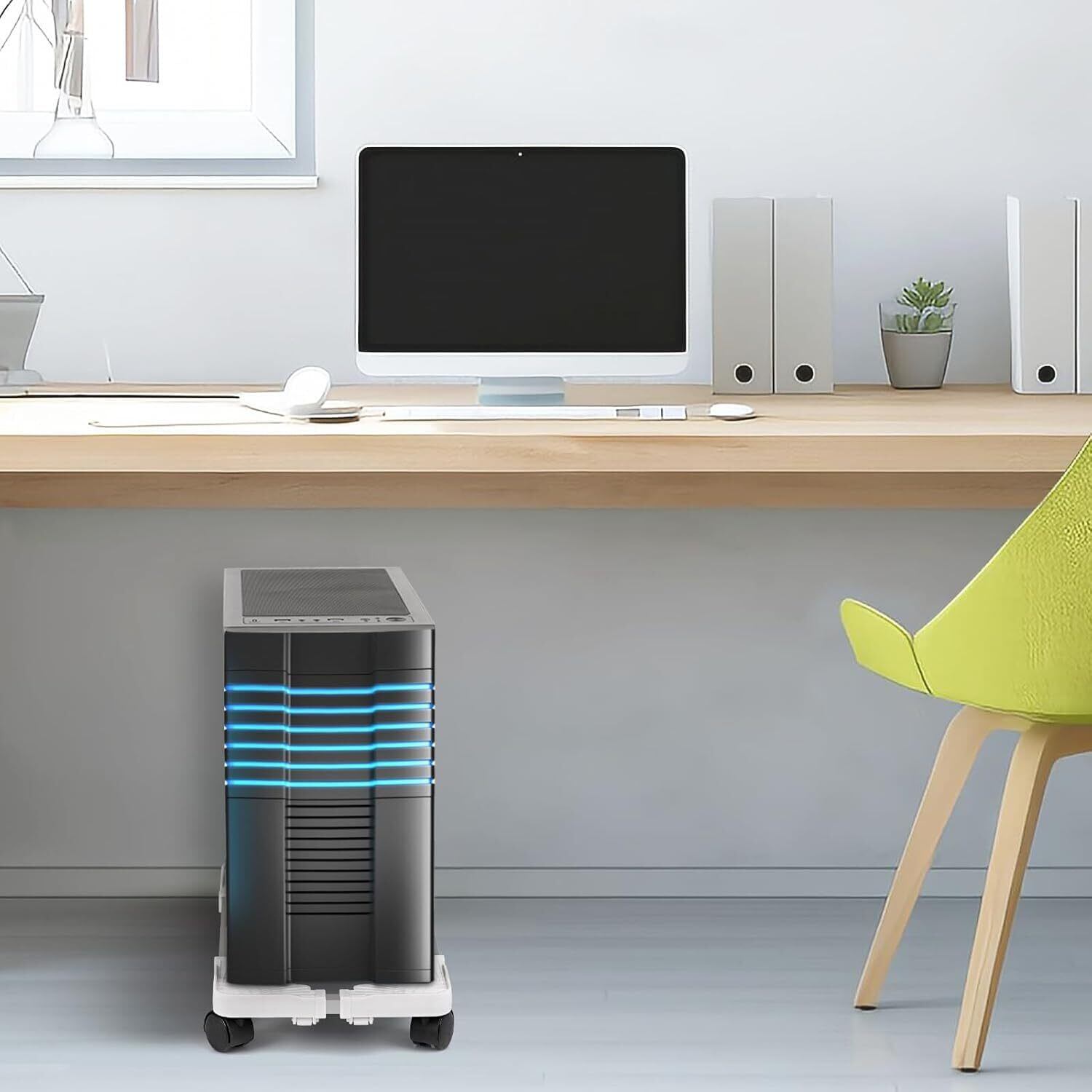 「このPCスタンドはキャスターが付いており、重たいCPUも簡単に移動できます。作業環境のレイアウト変更や掃除がスムーズに行え、活用の幅が広がります!忙しい日常の中でも、作業を快適にサポートします。」