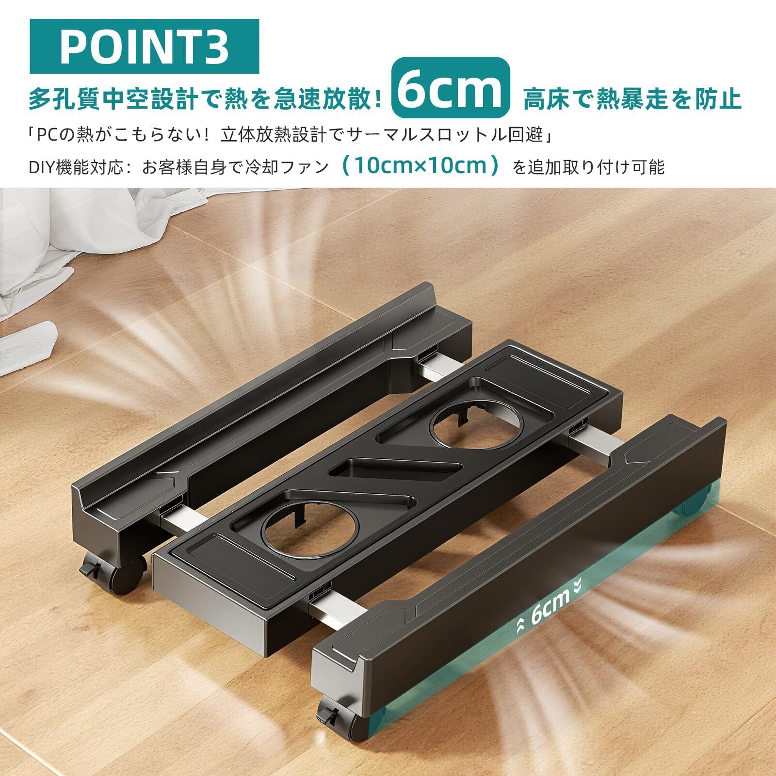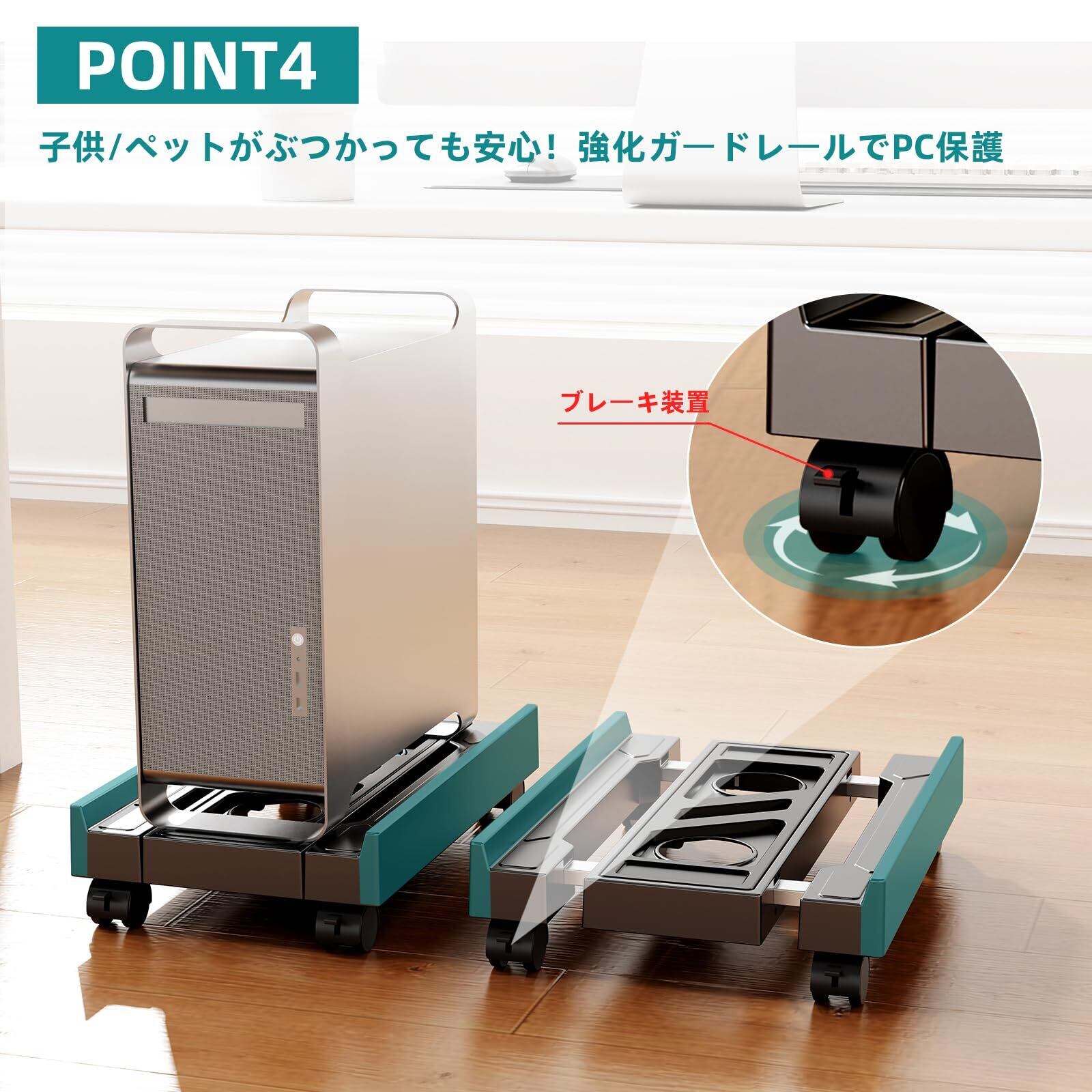「このPCスタンドにはキャスターが付いており、重たいCPUも簡単に移動できます。お掃除やレイアウト変更もスムーズに行えるので、忙しい時間の合間でも快適な作業環境を保つことができます!」