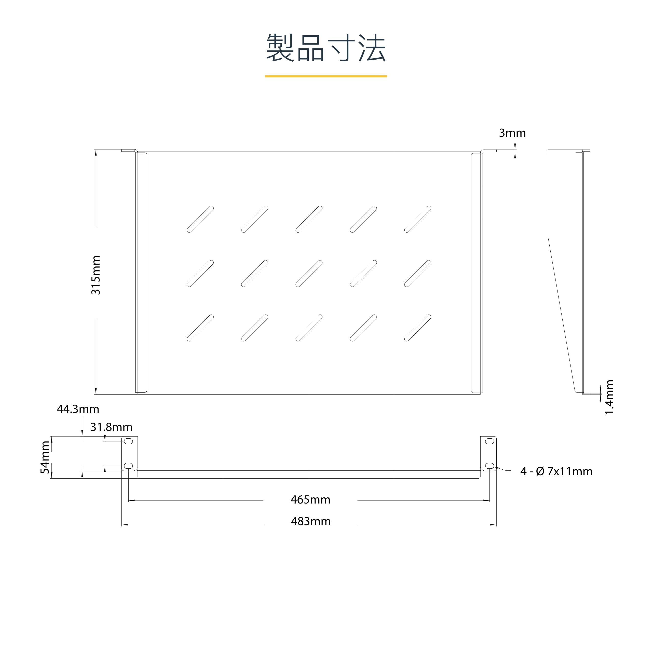 1U放熱スリット付きサーバーラック棚板。EIA-310準拠の19インチラックまたはキャビネットに対応し、機器の設置に適した奥行き31.5cmのスペースを確保します。放熱スリットにより通気性を高め、搭載機器を適温に保ちます。ケージナットとねじが付属しており、スピーディーに設置できます。このカンチレバー棚板は、16ゲージ(1.4mm)SPCC鋼製で、優れた耐久性と強度を備え、最大11.3kgまでの機器をしっかり支えます。サーバーラック用機器やアクセサリー、ラックマウント非対応のデバイスも収納でき、スムーズなアクセスと接続を実現します。棚板表面に設けられた大型の通気口により、放熱効果を促し、搭載機器の温度を適切に保ちます。