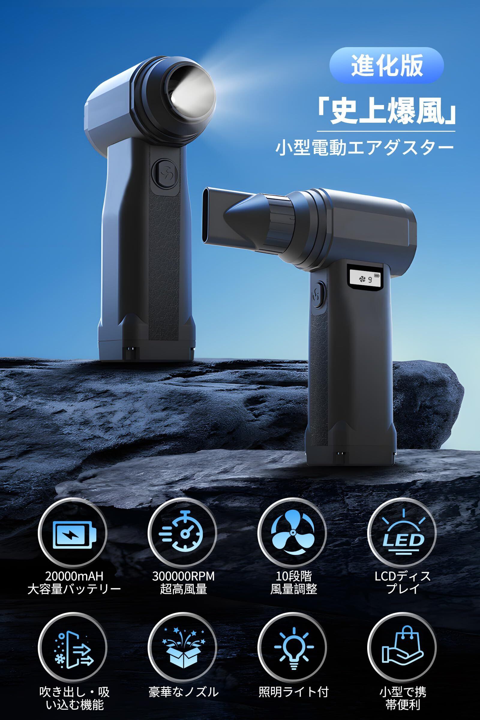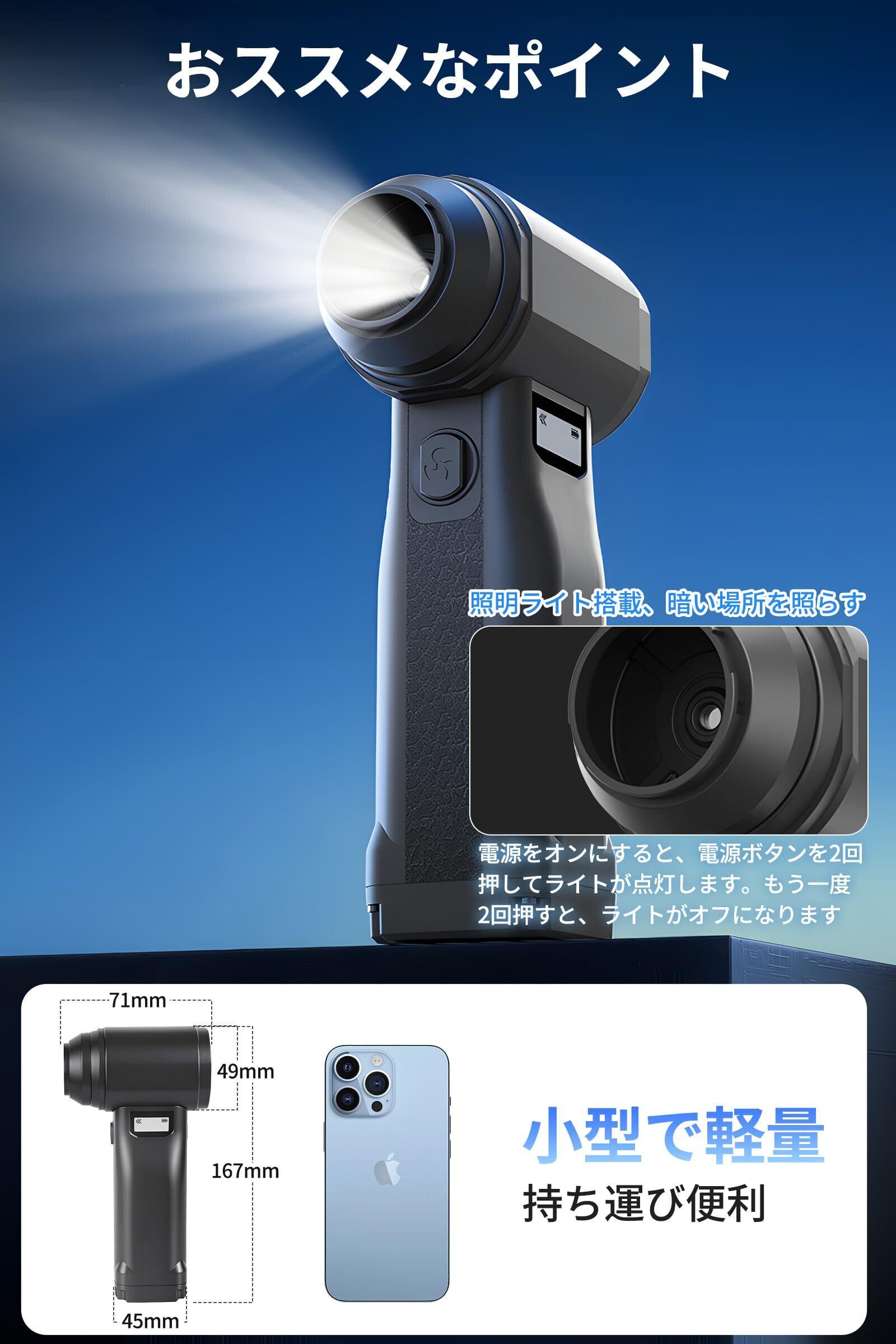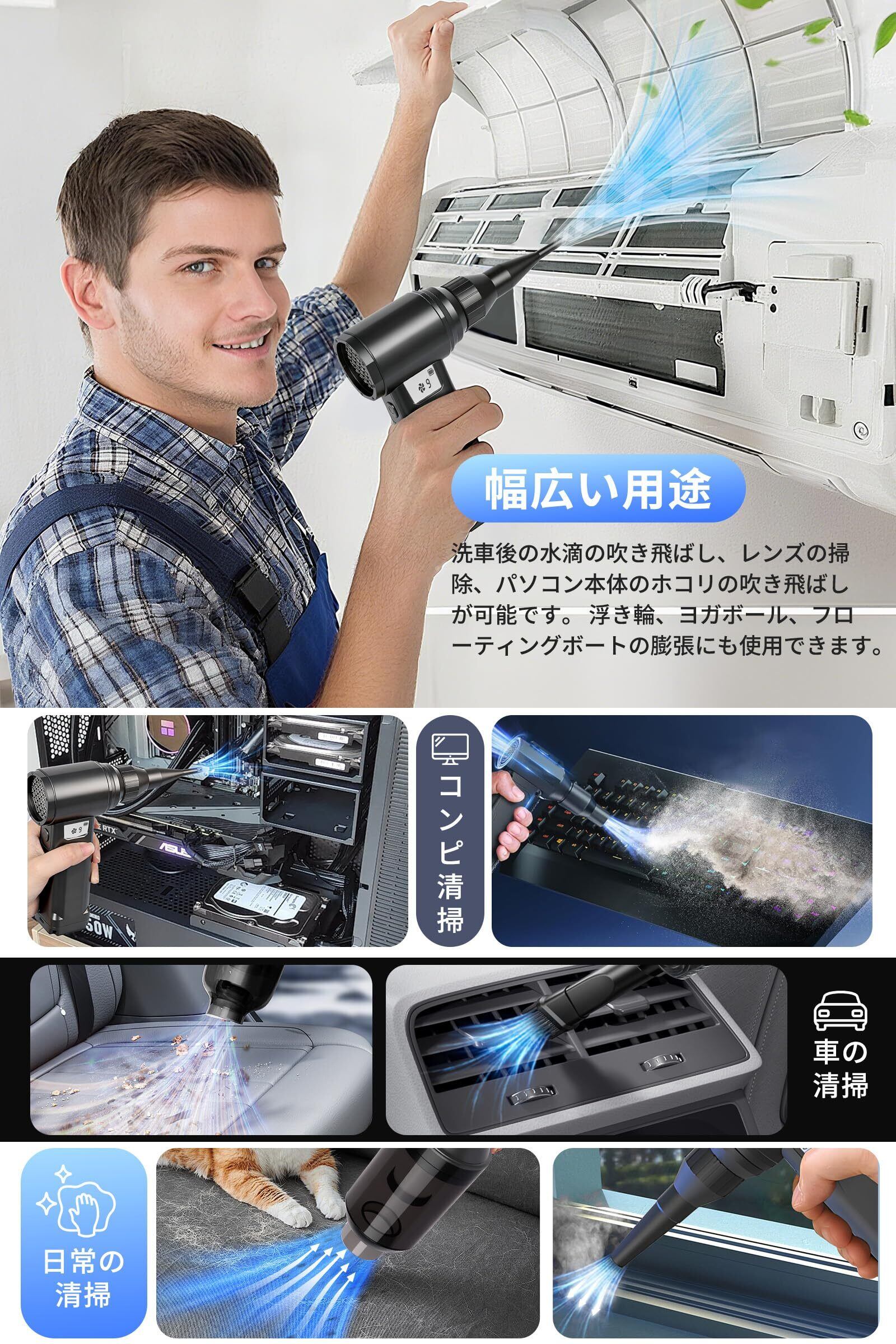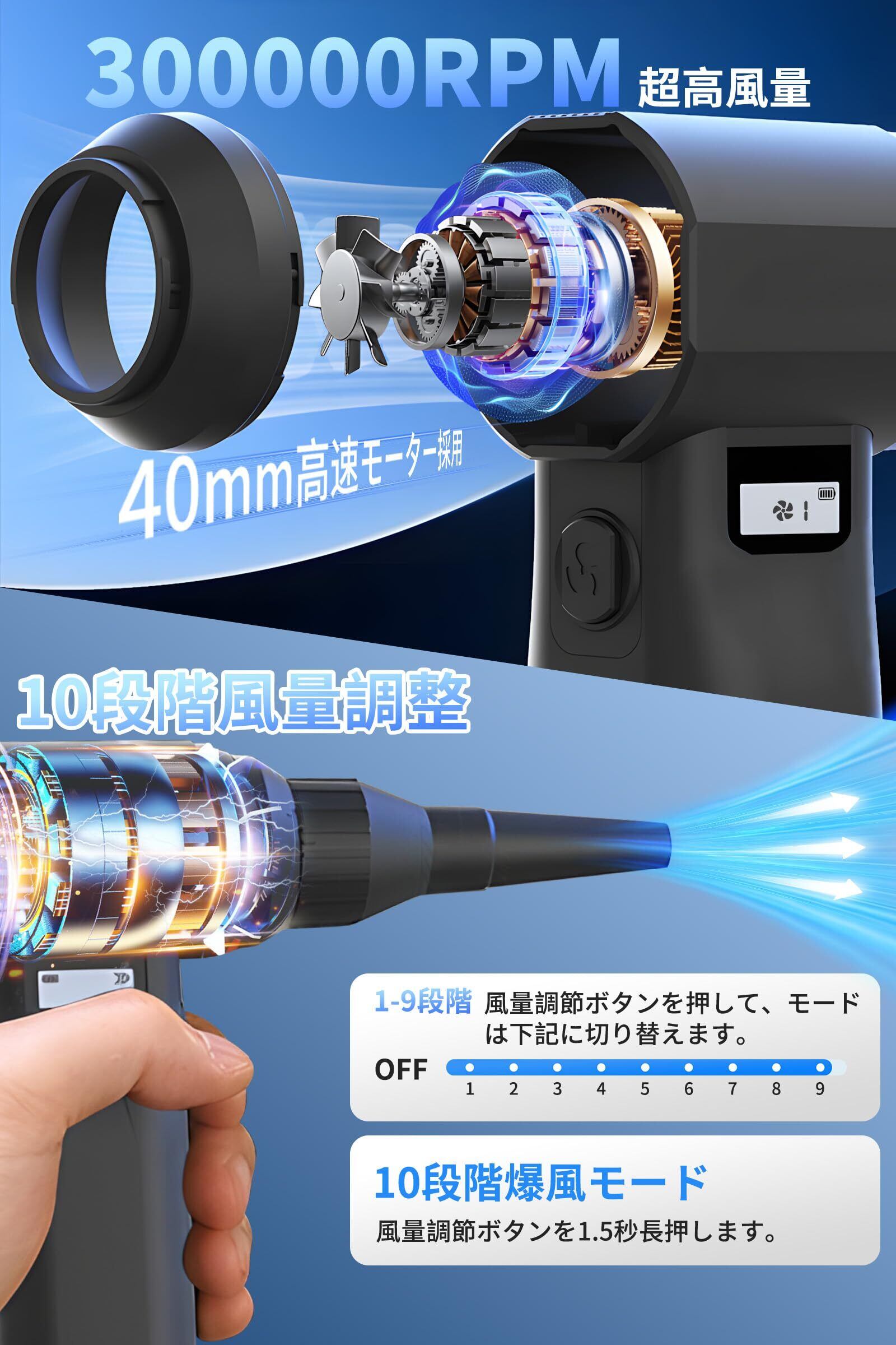 「『エアダスター 電動ブロワー』は、洗車やPC掃除、空気入れなど多種多様な用途に活躍する高性能なアイテムです。300000RPMの超強力な高速回転を実現し、10段階の風量調整が可能で、あなたのニーズに応じた最適な風量を選べます!」